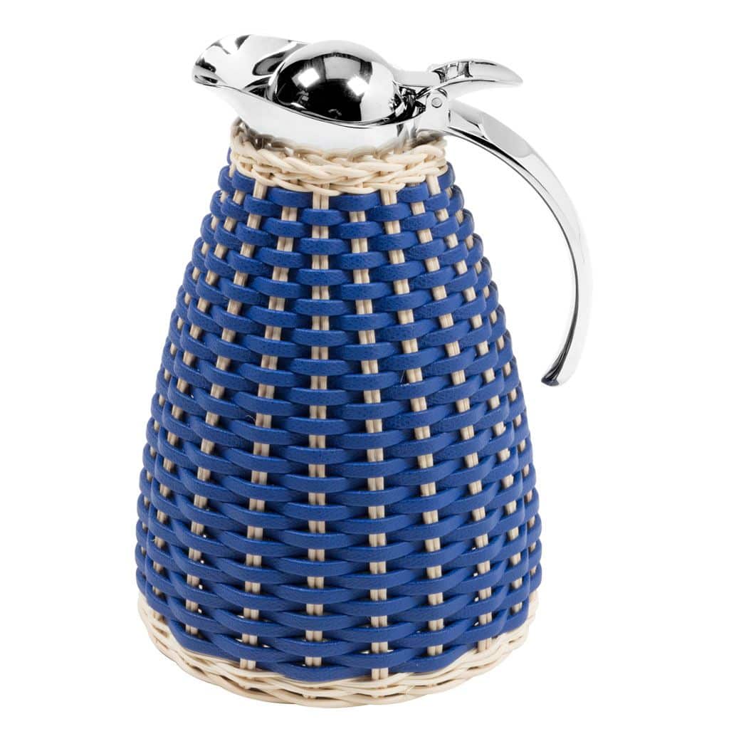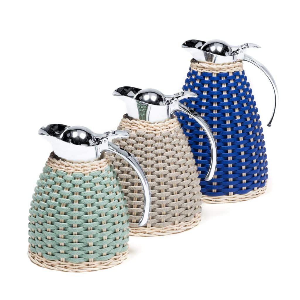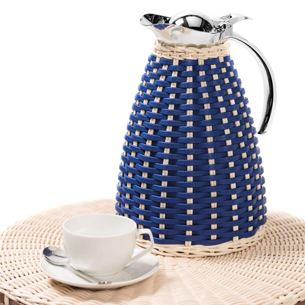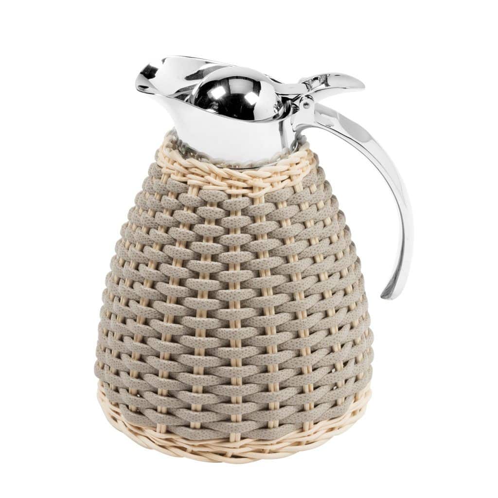 Insulated stainless steel carafes partially covered in woven leather and rattan with chrome plated finish. Two chamber glass structure able to maintain the liquid’s temperatures. Precise pouring thanks to the specially developed hinged lid with one-hand operation. Only available with natural rattan color.