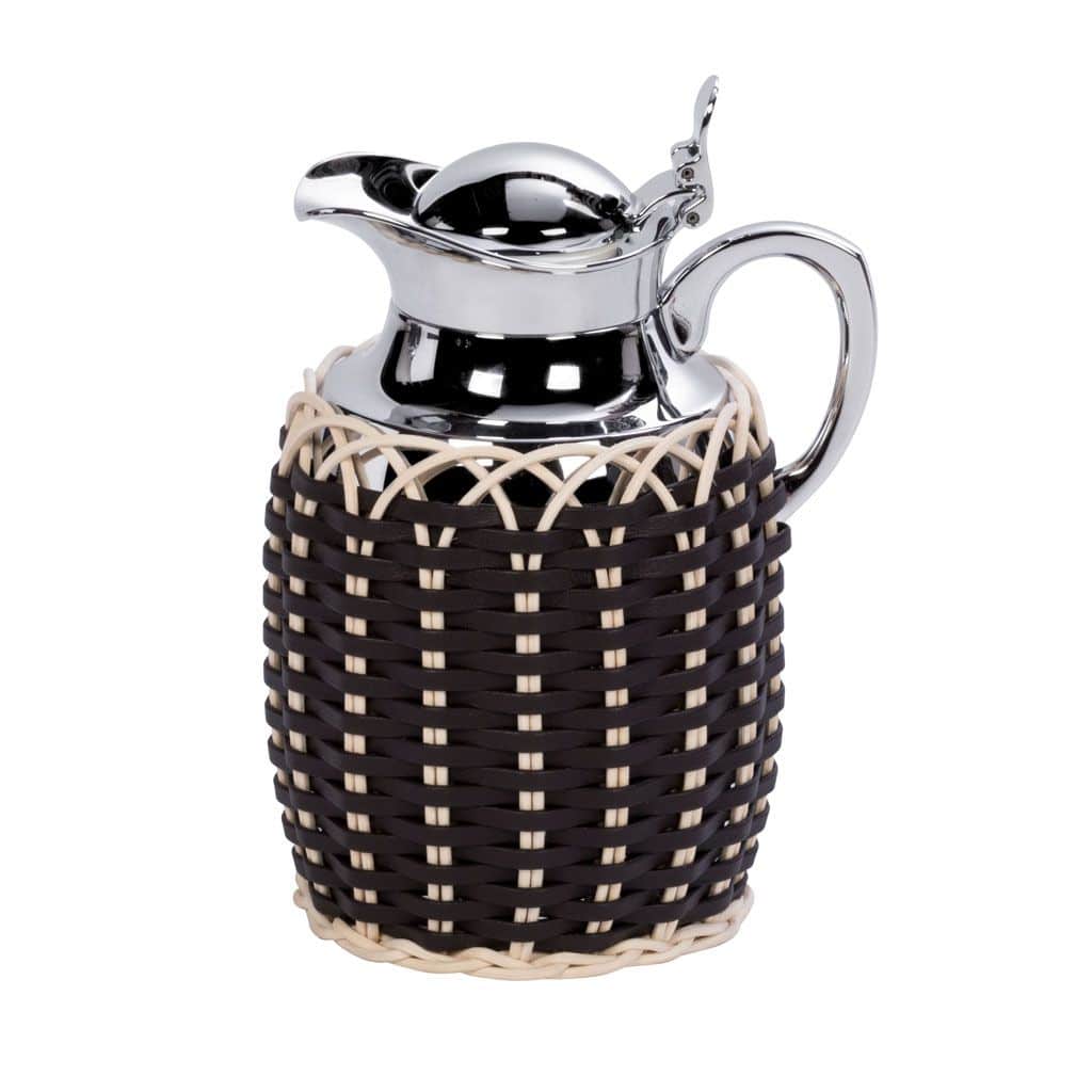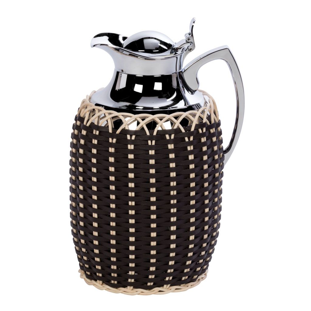 Insulated brass carafe partially covered in woven leather and rattan with a chrome plated finish. Two chamber structure able to maintain liquid’s warm temperatures for up to 12 hours and cold temperature for up to 24 hours thanks to the inner glass insert.