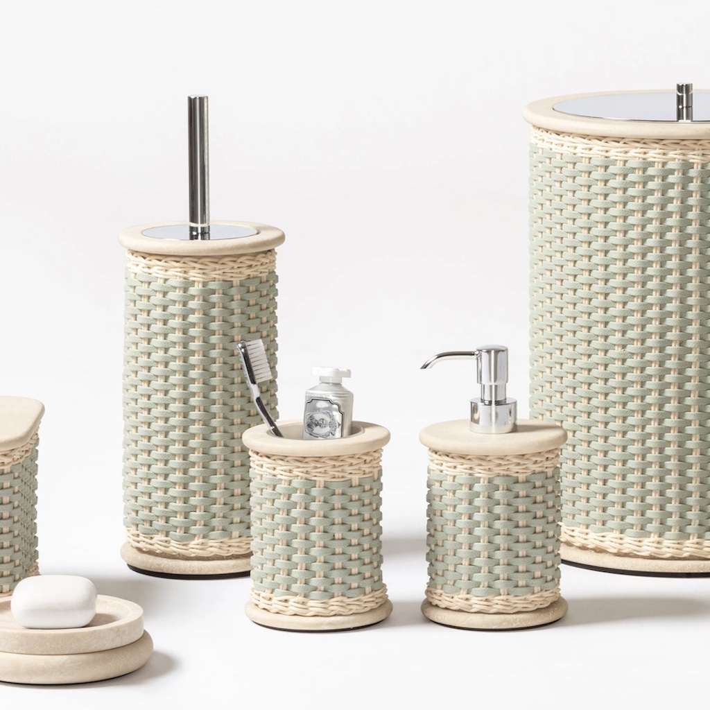 Crafted with meticulous attention to detail, this collection seamlessly merges the timeless allure of travertine with the warmth of woven leather and the organic charm of rattan. Metal finishes available: polished chrome, brushed brass and brushed bronze. Size: ø 12 cm – h. 35 cm.