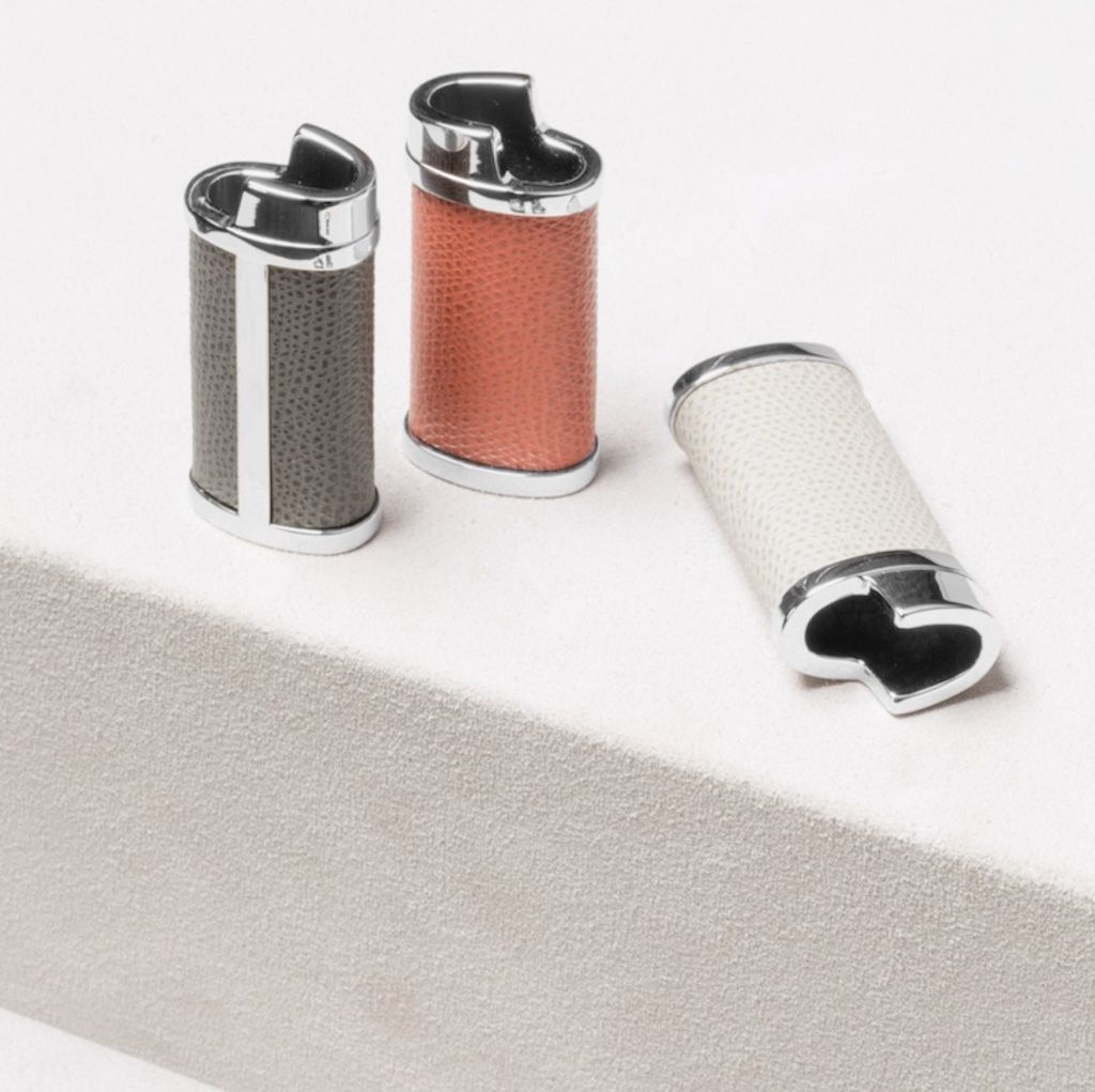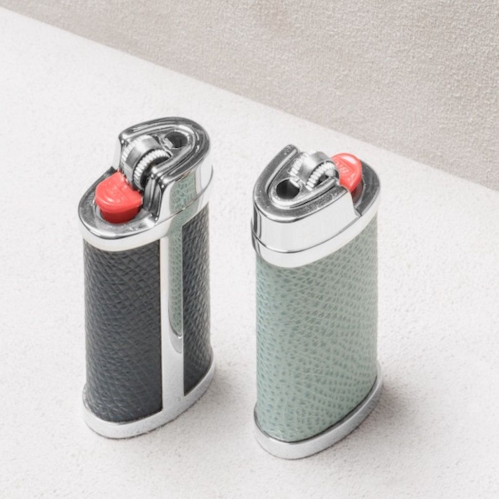Polished chrome structure featuring fine leather inserts. This leather case is ideal to host a bic mini lighter.