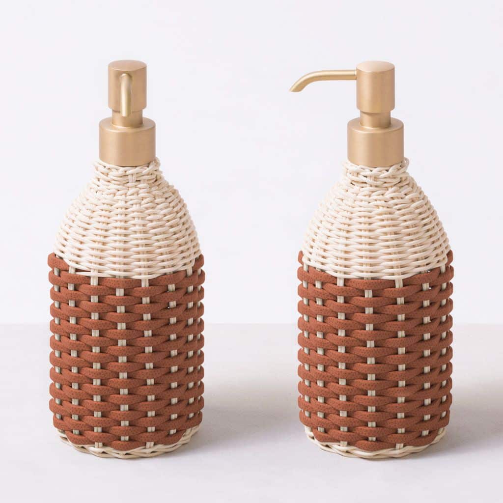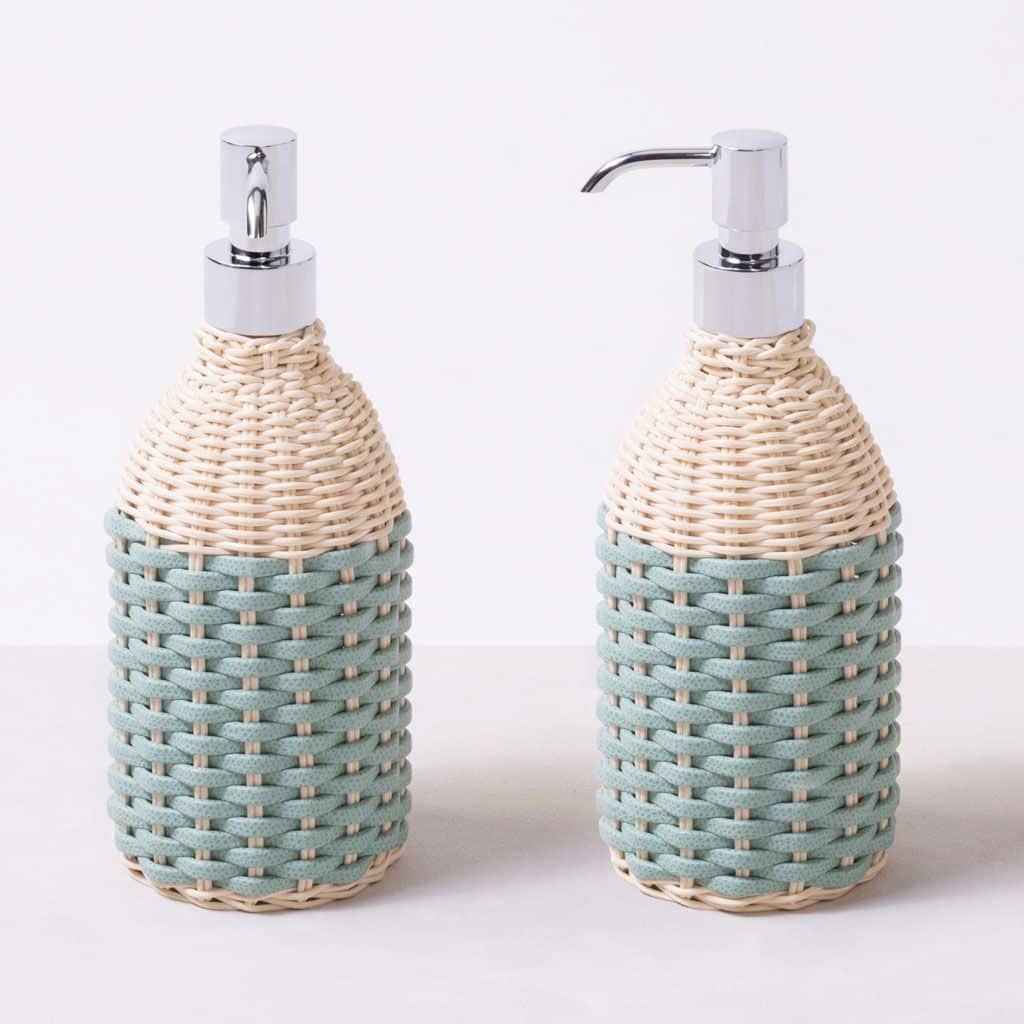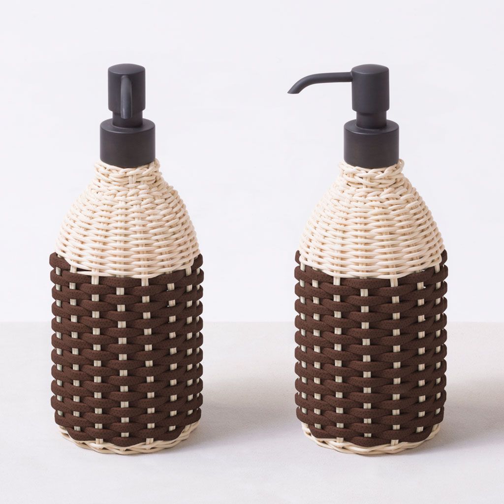 Dressed with woven leather and rattan. Different finish available. Only available with natural rattan color. Size: ø 8,5 cm – h. 23 cm