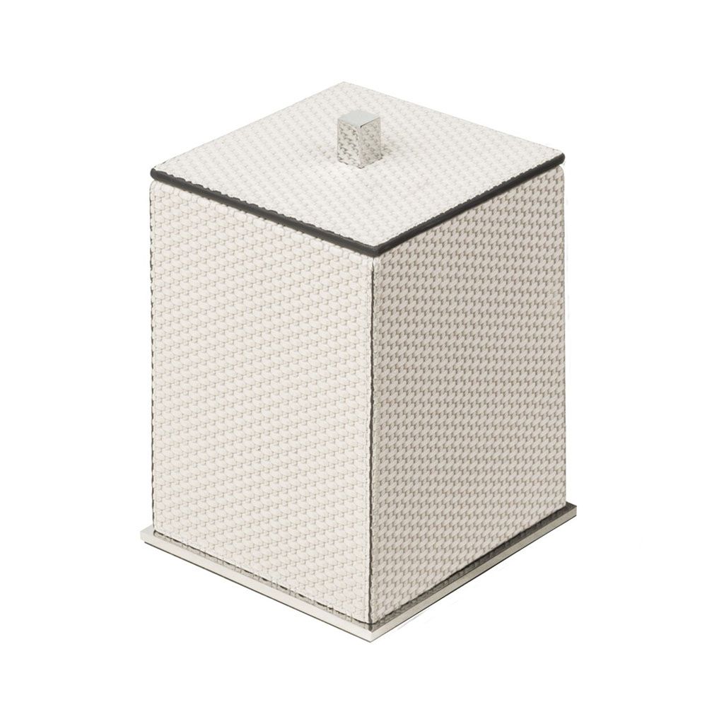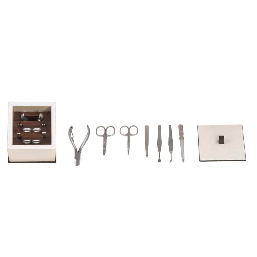 Leather covered wooden structure. Metal base frame and metal handle are available in three finishes: chrome, brass, bronze. Set equipped with the following tolls: cuticle  scissors, nail scissors, nail file. The manicure instruments are temperated stainless steel and made in italy. Size: 11,5×11,5 cm – h. 17 cm