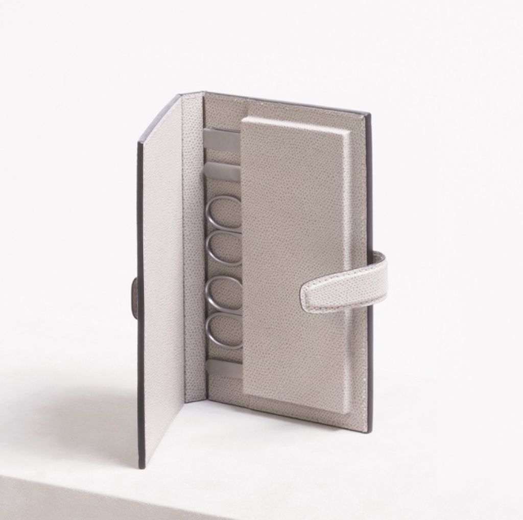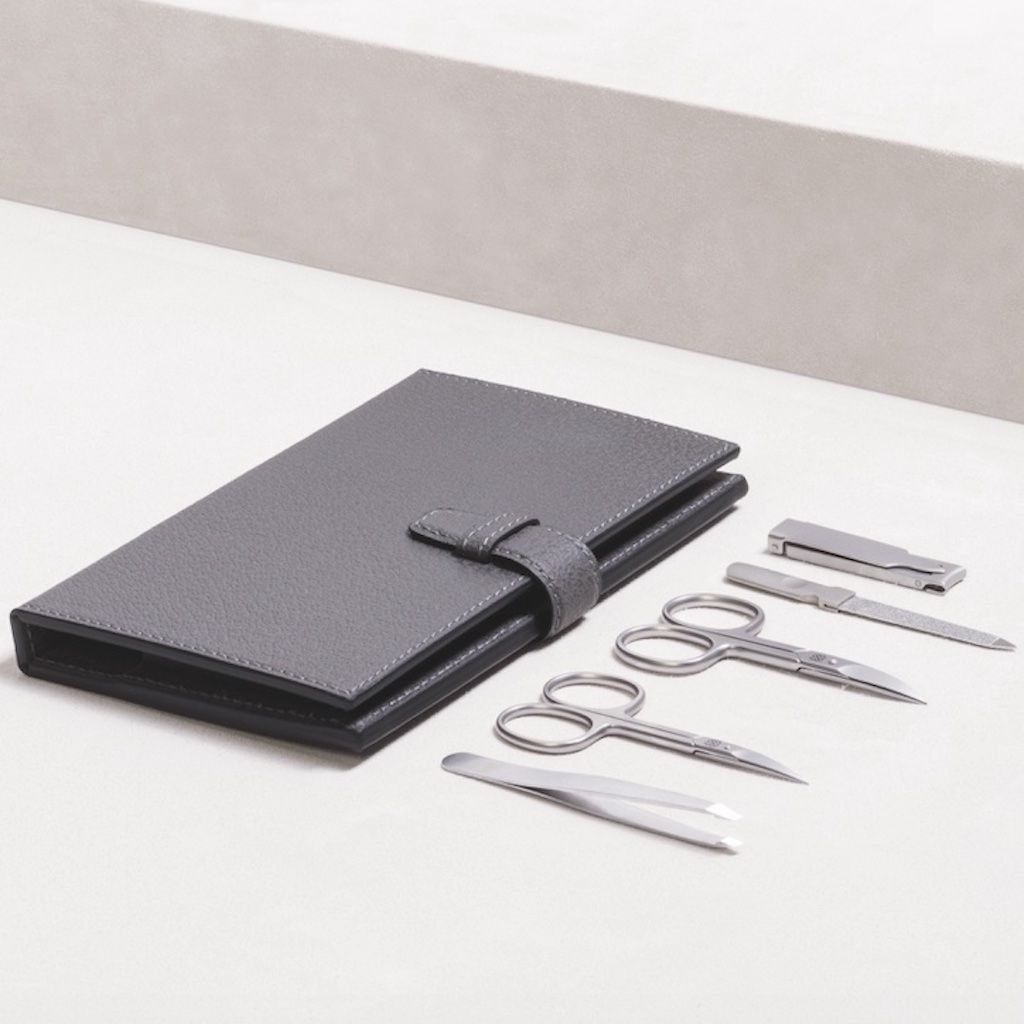Envelope in calf skin leather. Set equipped with the following tolls: cuticle scissors, nail scissors, nail file. The manicure instruments are temperated stainless steel and made in Italy.