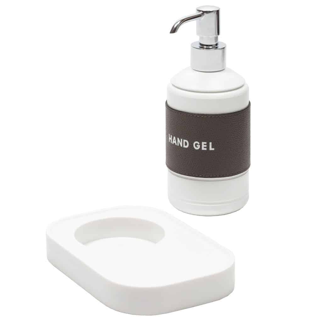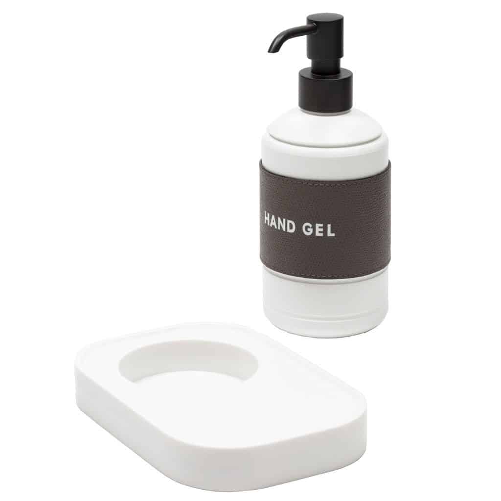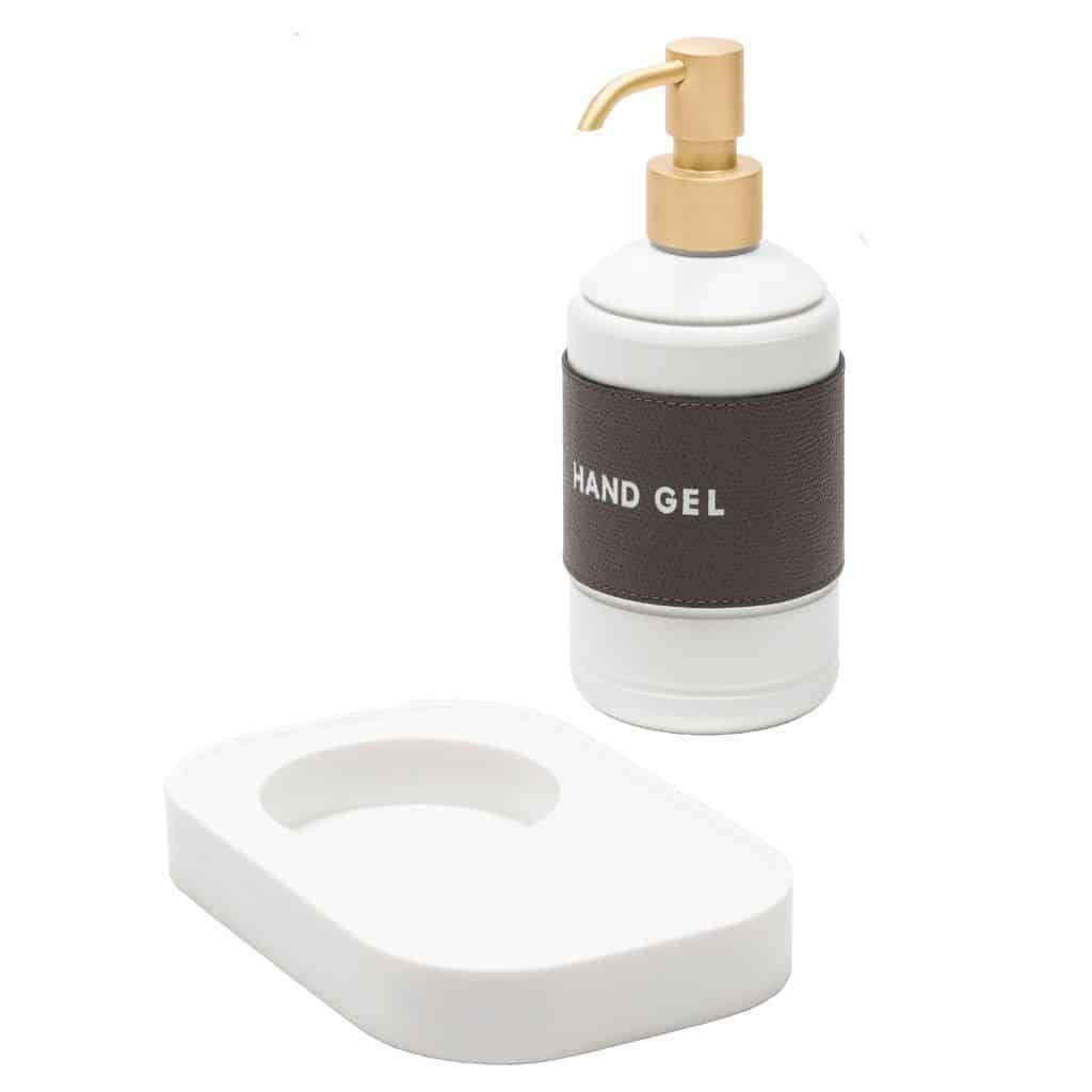 Partially dressed with the finest italian leather, this hand sanitizer dispenser with a capacity of 500ml. It is ideal for hotels, yachts, offices, shops, private residences and interiors in general, especially the ones with potential high traffic areas, helping to maintain a clean environment, reducing the spread of germs. It features a corian drip tray with the nesting space for an abs bottle, provided with a spout available in three metal finishes of choice: polished chrome, brushed brass and brushed bronze. Corian and abs are highly resistant materials, while the decorative leather stripe is fixed on a safe area, which allows to avoid damage due to alcohol contained in the sanitizing gel. Size: 17×11,5 cm – h. 19,5 cm