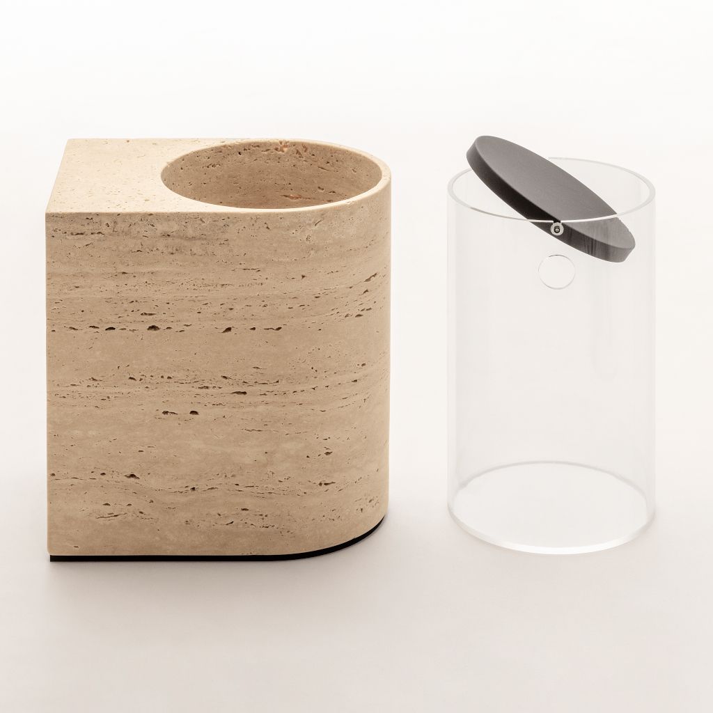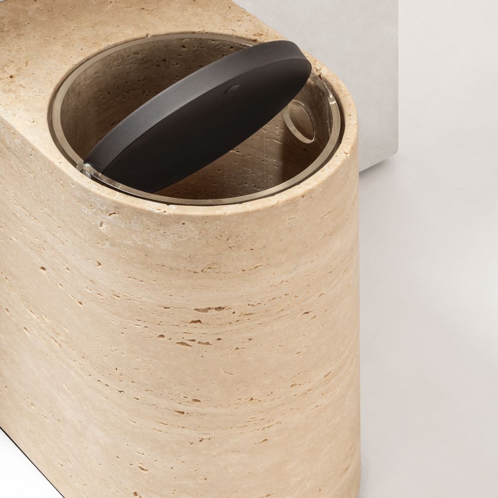 Defined by single, sculptural volumes and pure, graphic silhouettes, the pieces of the Nobble bathroom set embody the meeting of timeless aesthetics and modern sensibility. Travertine surfaces rest on brushed burnished bronze bases and are enriched with matching bronze details, while removable containers ensure practicality without compromising style.