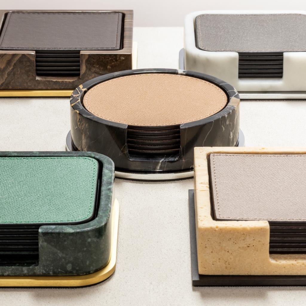 Marble structure able to host 6 leather coasters.