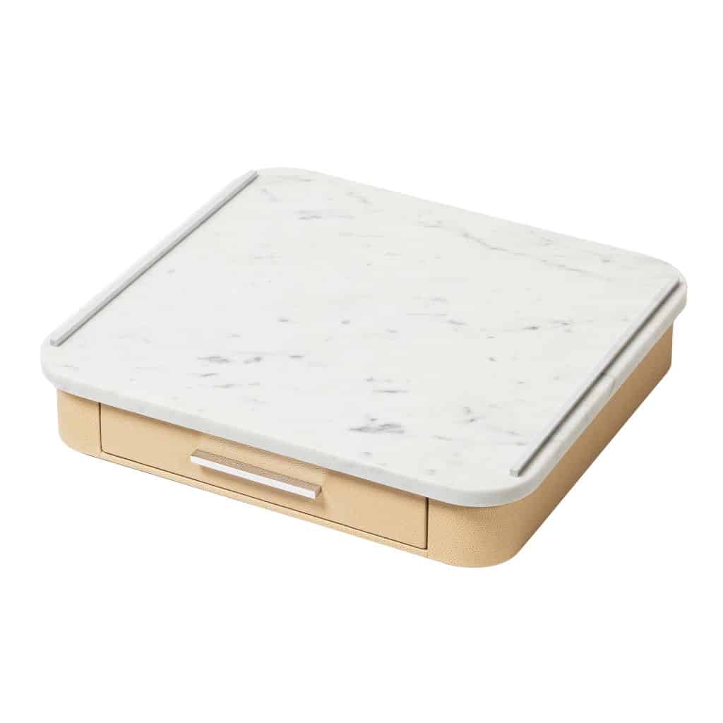 Leather-covered wood structure, top in marble with metal inserts available in three finishes: chome, brass, bronze. The drawer features inner walnut wood partitions to host coffee spoons, sugar and 20 nespresso classic capsules. Size: 39 x 39 cm – h. 8,5 cm