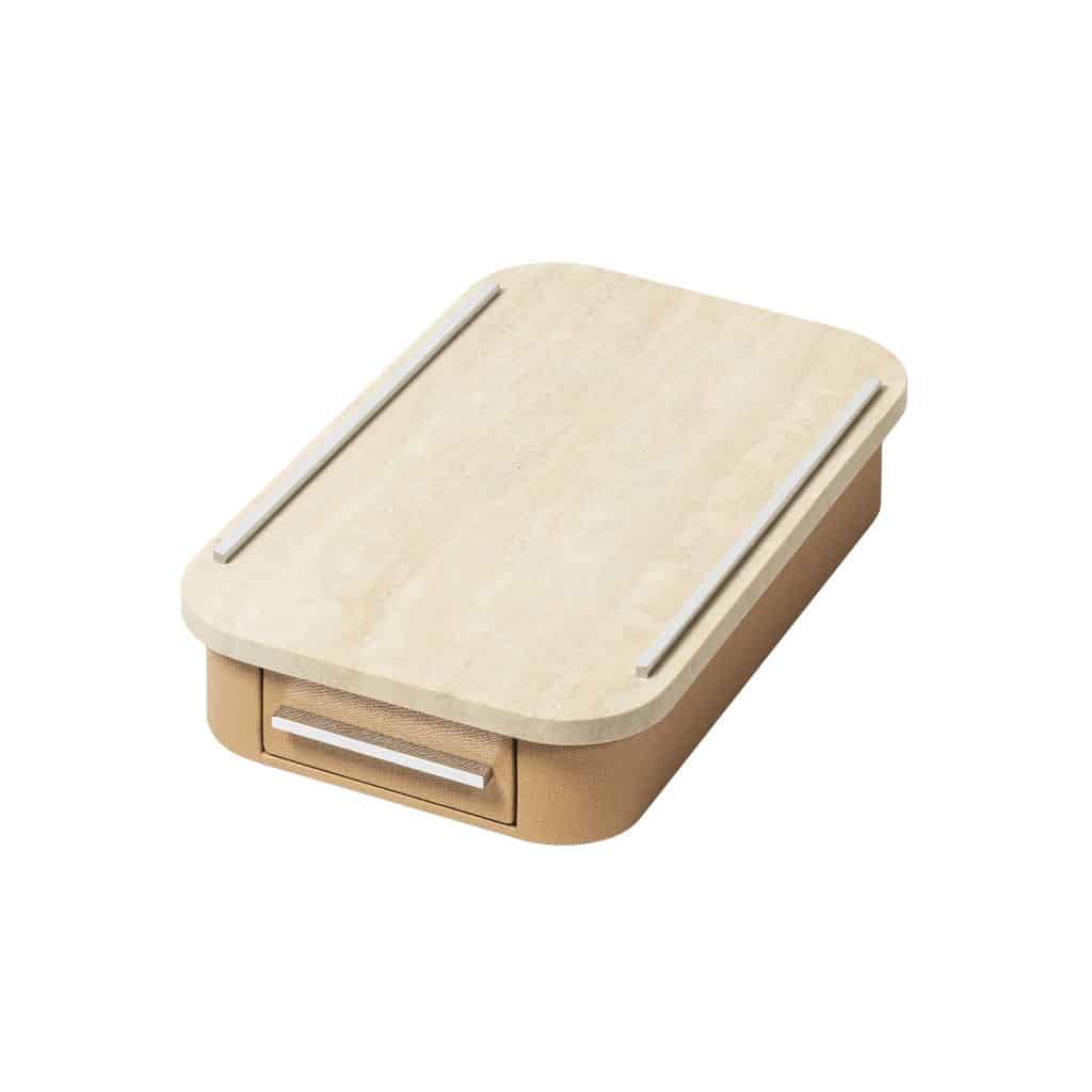 Leather-covered wood structure, top in marble with metal inserts available in three finishes: chome, brass, bronze. The drawer features inner walnut wood partitions to host 10 nespresso classic capsules. Size: 39 x 22,5 cm – h. 8,5 cm