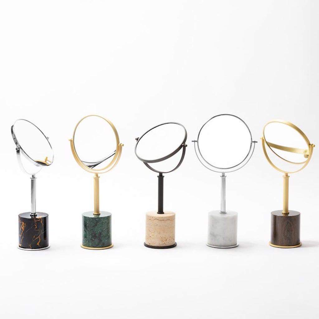 Metal structure available in different finishes featuring a heavy marble base that grants perfect stability. The mirror rotates for a choice of 2x magnification or standard reflection.