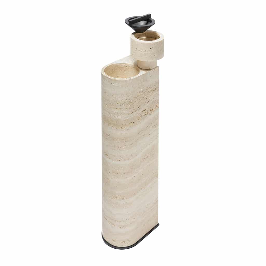 Materials: travertine structure with brushed burnished bronze base and removable ash container