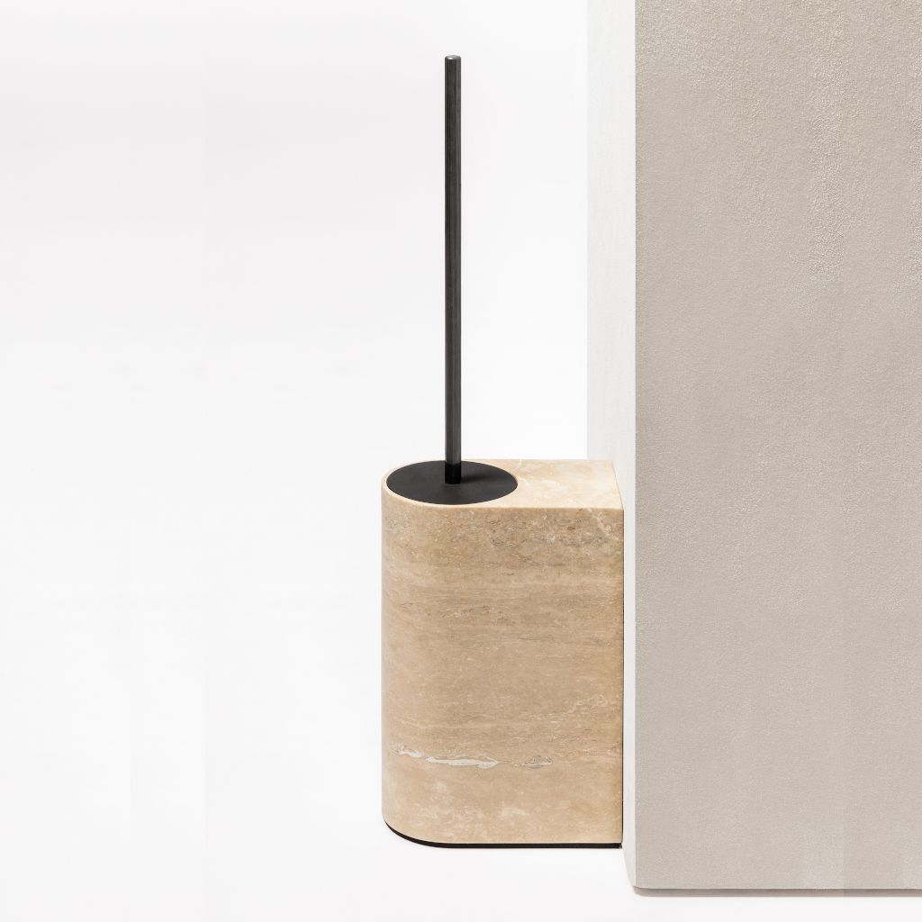 Defined by single, sculptural volumes and pure, graphic silhouettes, the pieces of the Nobble bathroom set embody the meeting of timeless aesthetics and modern sensibility. Travertine surfaces rest on brushed burnished bronze bases and are enriched with matching bronze details, while removable containers ensure practicality without compromising style.