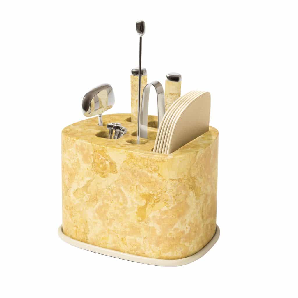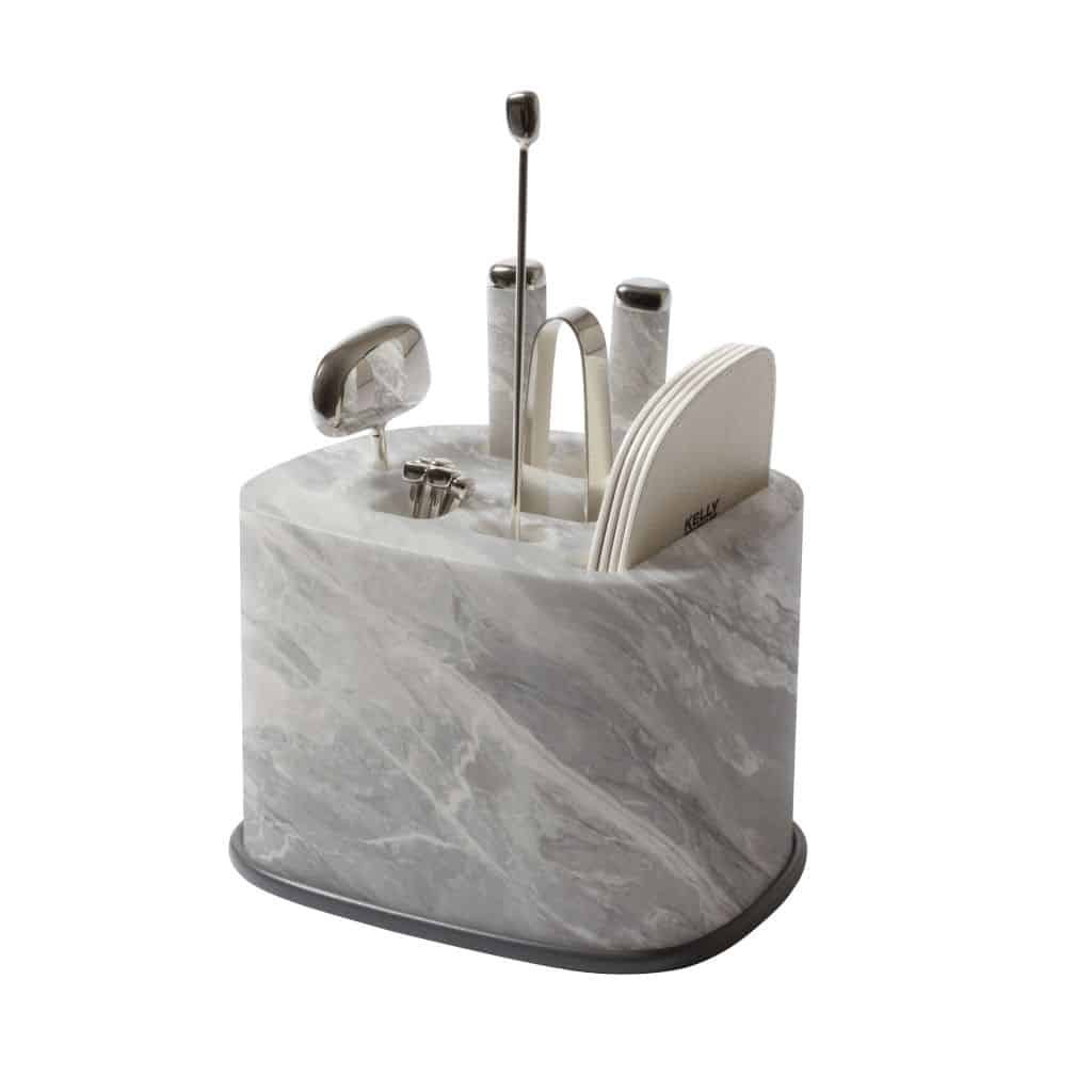 Marble structure featuring sandblasted aluminium accents. It hosts the following polished stainless steel tools:1 x corkscrew, 6 x cocktail picks, 1 x bottle opener, 1x knife, 1x ice tongs, 1 x mixing spoon, 6 x leather coasters.