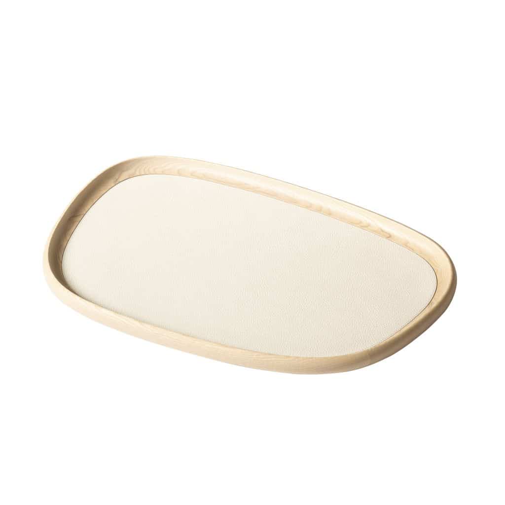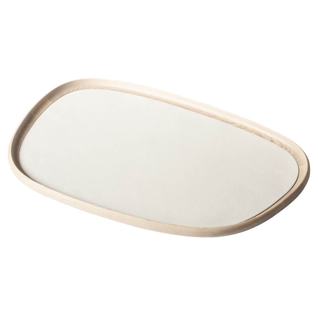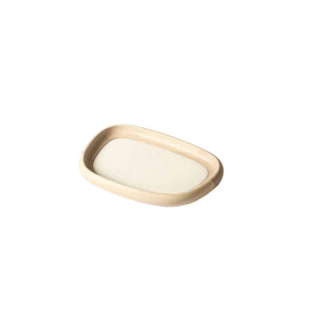 Wooden trays with removable leather inlay. Non-slip waterproof rubber base underneath. Color: deer print leather ivory – natural wood. Different sizes available.
