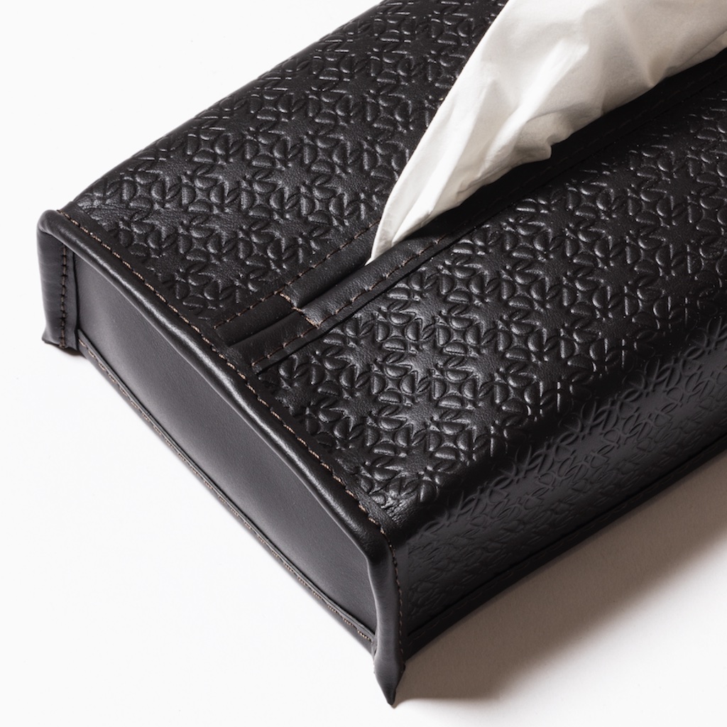 Leather tissue box cover featuring the elie saab monogram pattern.