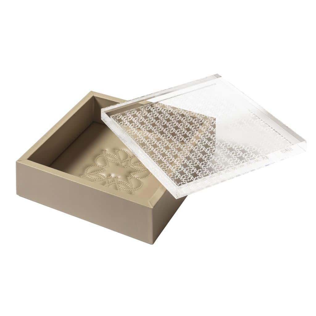 Leather box with padded elie saab monogram lining and carved acrylic lid. Size: 17 x 17 cm – h. 8,5