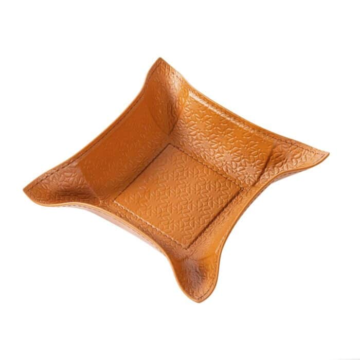 Valet tray with leather lining featuring the elie saab monogram pattern. It features a metal structure with rigid core and bendable sides.