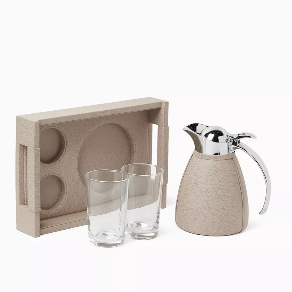 The set includes a small beaubourg tray with spaces to host, with perfect stability, two fine crystal glasses and one carafe.