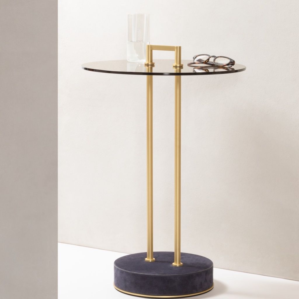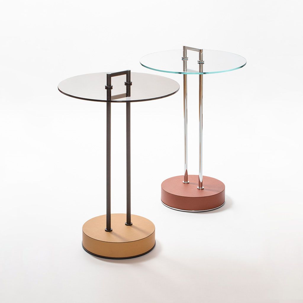 Metal structure available in three different finishes featuring a fine leather-covered base and a glass top which can be either transparent or dark bronze-colored. This slim, elegantly functional occasional table is the ideal solution to enhance any corner of a home. Different finishes available: chrome, brass, bronze.