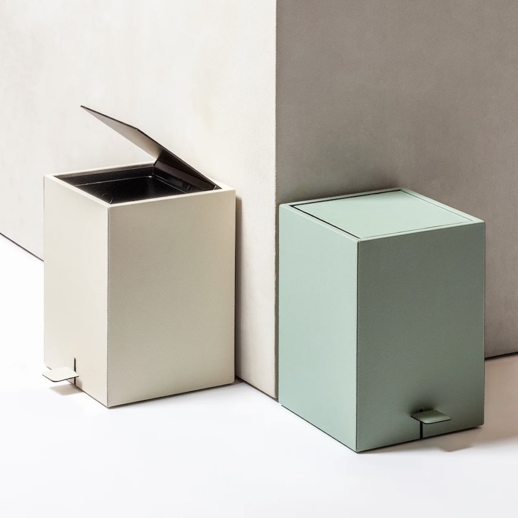 Leather-covered wood structure with non-slip waterproof rubber base underneath and leather covered pedal. The removable plastic inner container grant an easy cleaning.