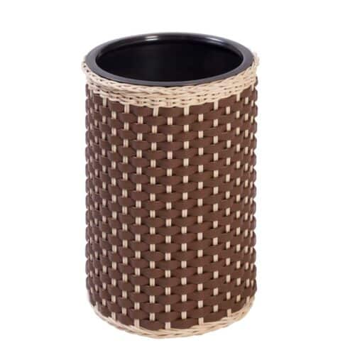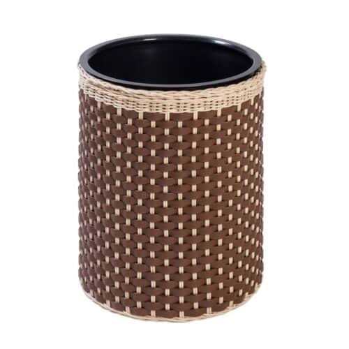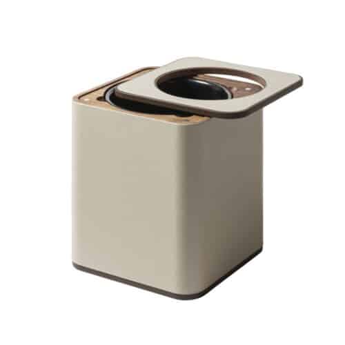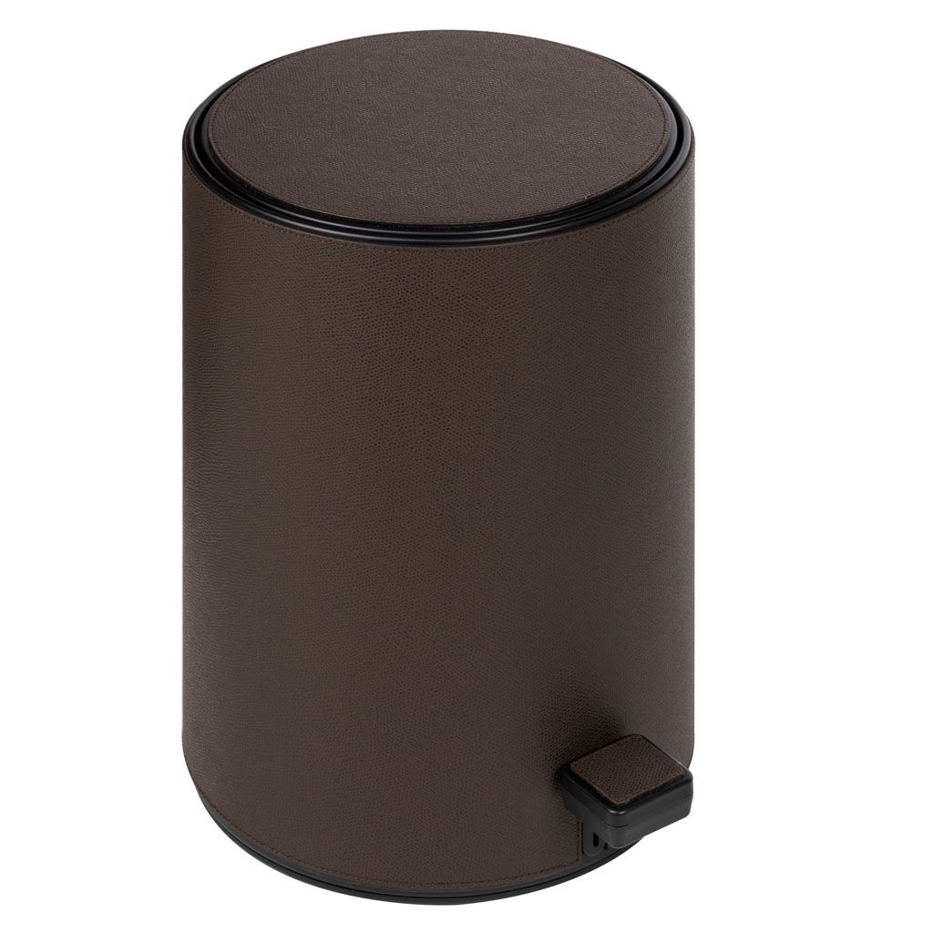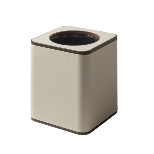 Leather covered metal structure with non-slip waterproof rubber base underneath. Removable washable plastic inner container with handle.