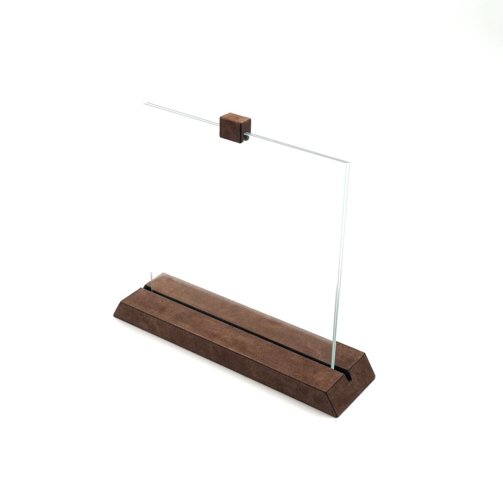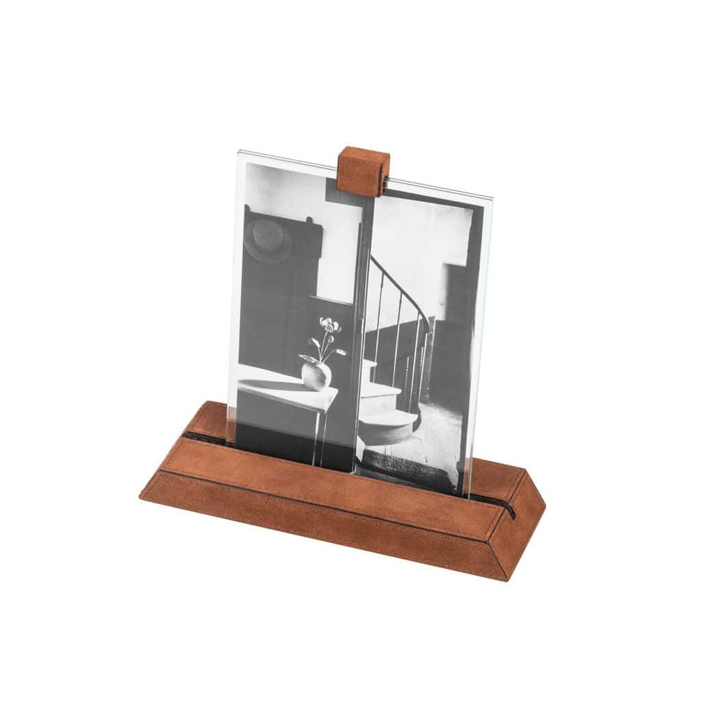 Wood base covered in handcrafted leather. Pictures can sit horizontally or vertically.