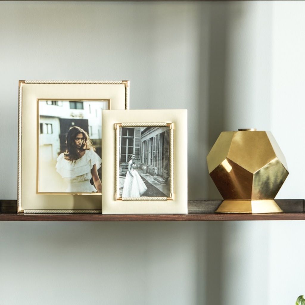Leather frame, inner chrome or gold metal trim, outer braided trim.