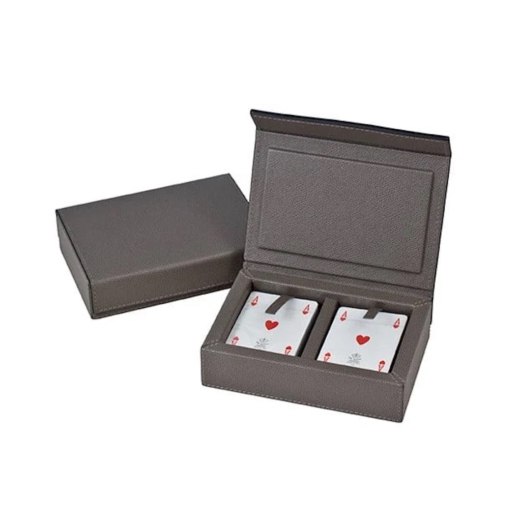 Handcrafted walnut case covered in leather with special magnetic closing. Includes 2 decks of playing cards. Size: 13×18 – h. 4,5 cm.