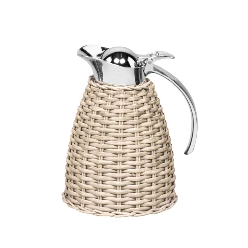 Partially rattan covered insulated stainless steel carafes with chrome-plated finish. Two chamber stainless steel structure able to maintain liquid’s warm temperatures up to 12 hours and cold temperatures up to 24 hours thanks to the inner glass insert. Precise pouring thanks specially developed lid with one-hand operation.