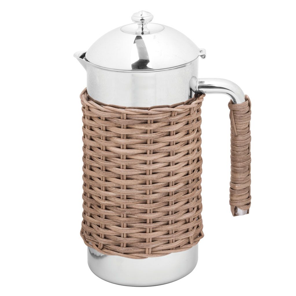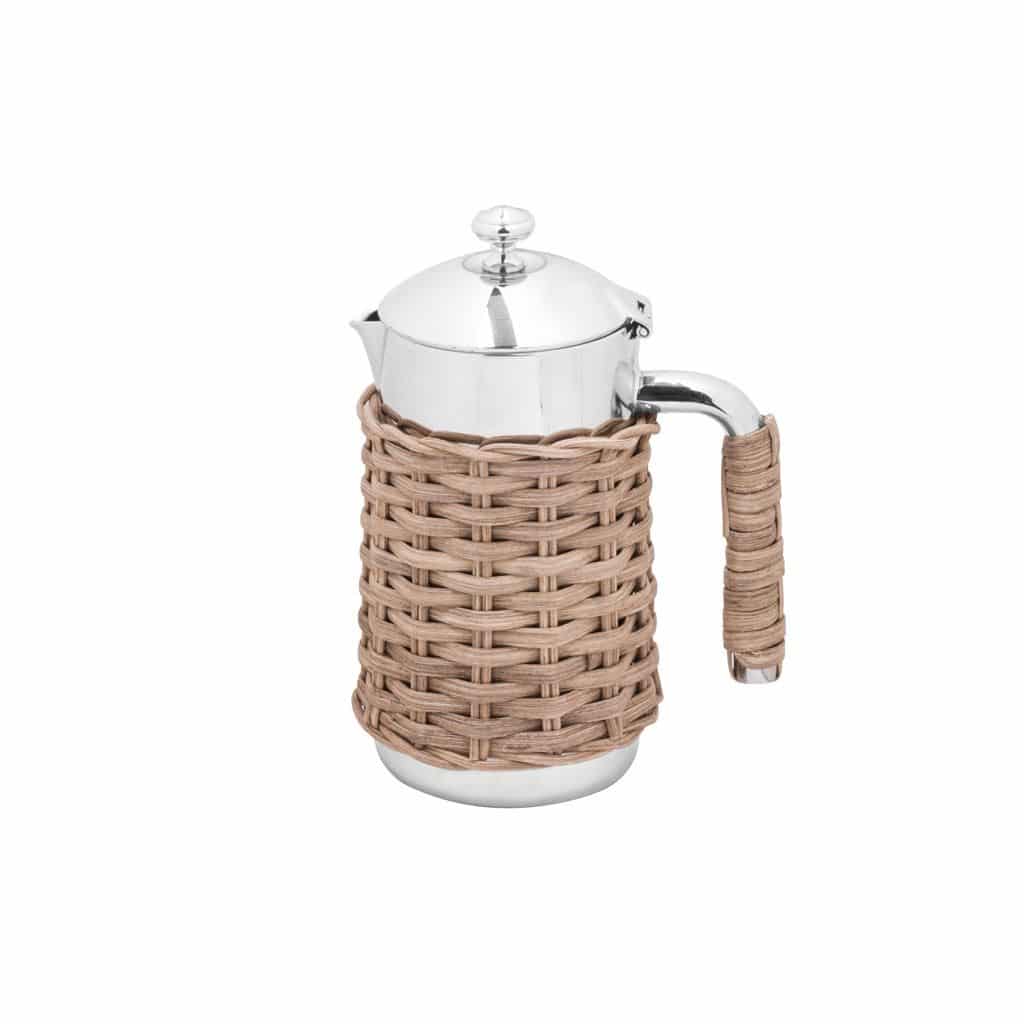 Insulated stainless steel carafes with chrome plated finish and partially covered in woven rattan. Two chamber stainless steel structure able to maintain the liquid’s temperatures.
