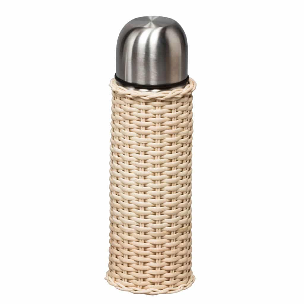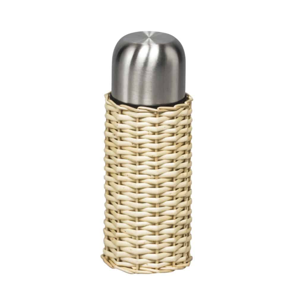 Partially rattan covered vacuum flask with a stainless steel double walled body. Features a wide opening, quick-stop system for easy pouring and removable drinking mug.