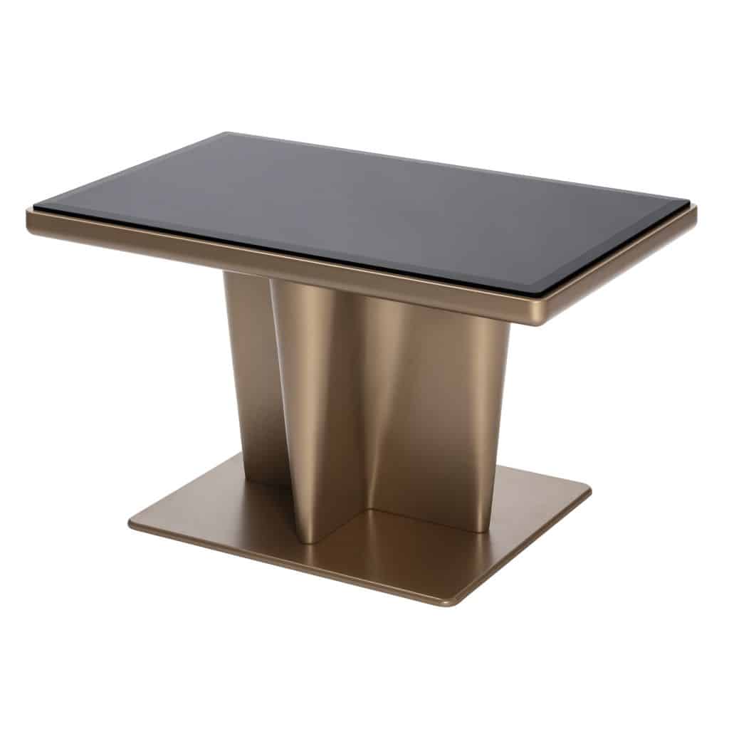 Tanell blends a minimalist, contemporary design and a sleek yet strong appeal. The trilobed base tapered downwards accompanies the gaze toward the top making this table not only an iconic piece, but an ideal display unit as well. Materials: raw bronze or dark bronze-lacquered wood structure with bronze-colored glass top insert. Lacquered wood finishes available: raw bronze. Size: 80 x 52 cm – h. 47 cm