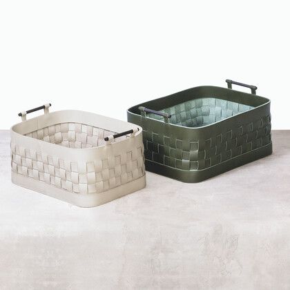 Braided water resistant saddle leather storage basket with brushed bronze handles.