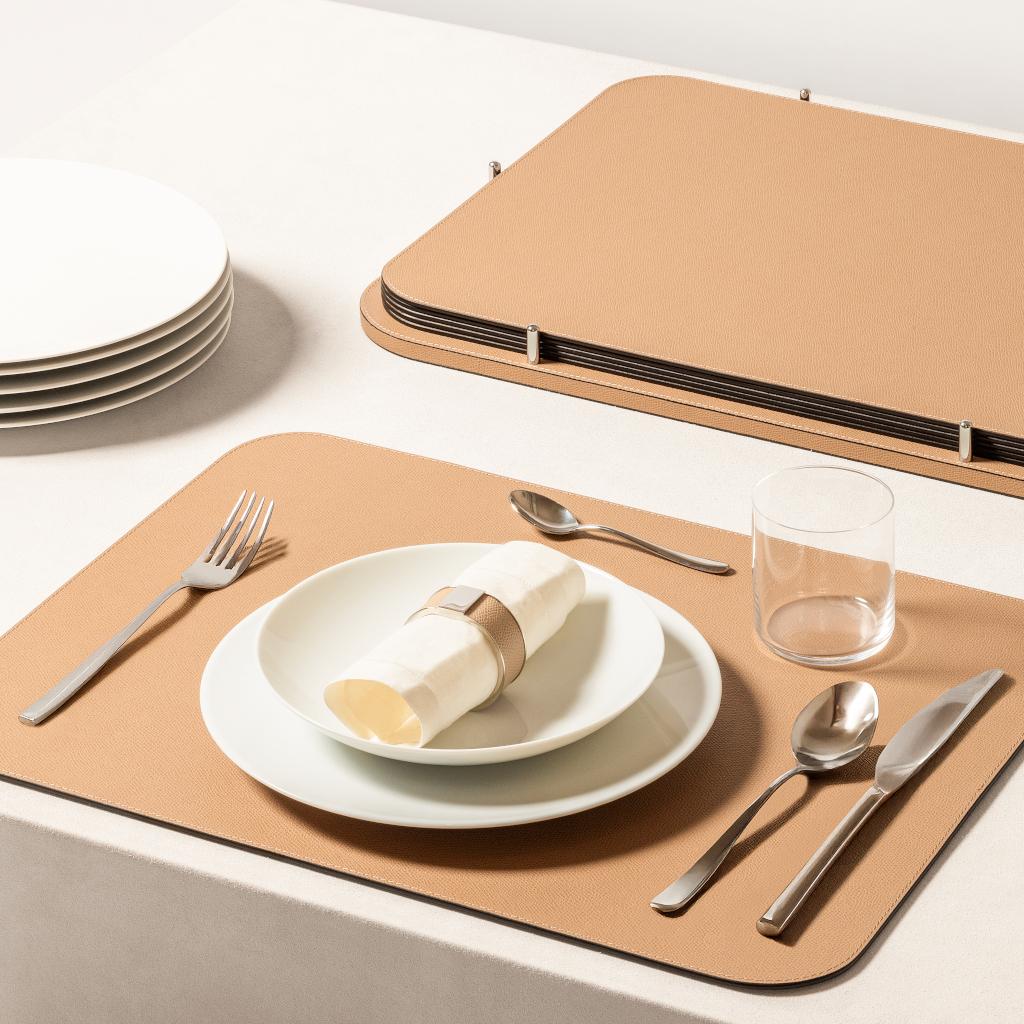 Leather-covered base paired with polished chrome pins that keep 6 placemats neatly aligned, combining order and tactility in a discreet, functional table accessory.
