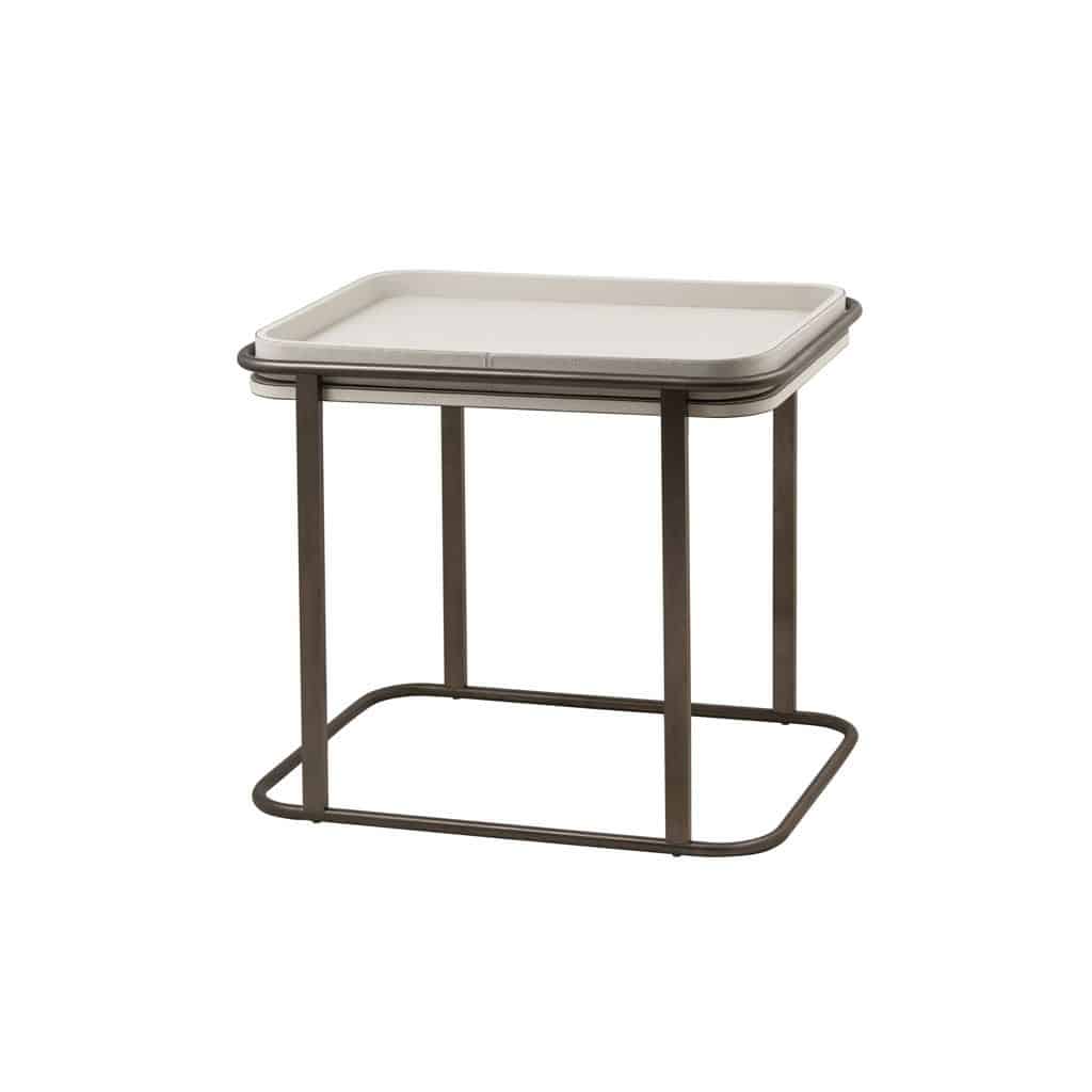 Metal structure available in 3 finishes: brass, chrome, bronze. Leather covered wood top and removable tray.
