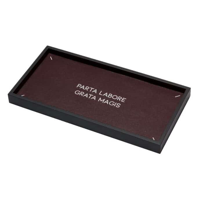 Showcasing ancient mottos taken from the latin tradition, the heritage collection features walnut and wenge wood valet trays with printed leather lining. ‘parta labore grata magis’. English translation: ‘what requires effort is more rewarding’. Print only in calfskin nappa f17 bordeaux + white writing.
