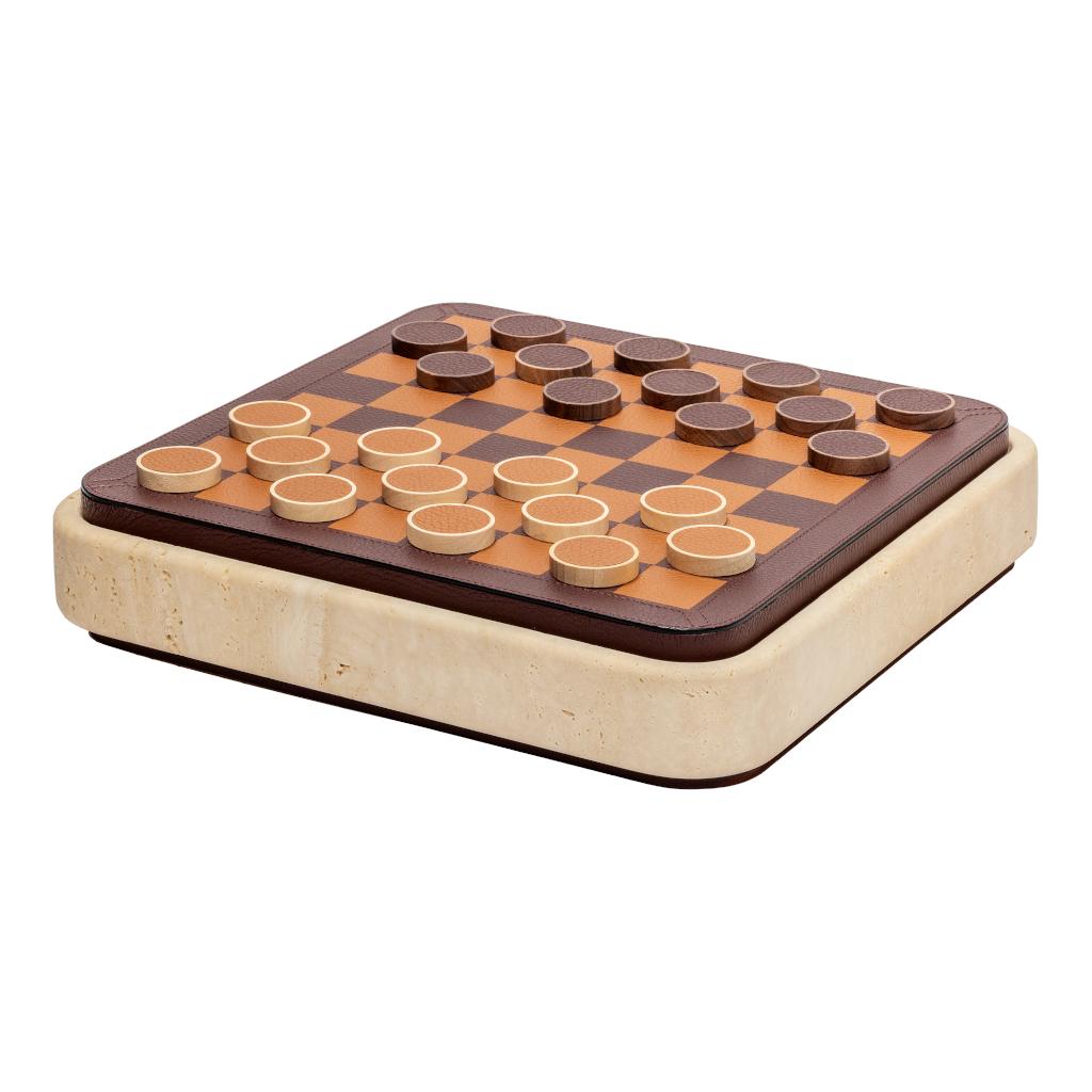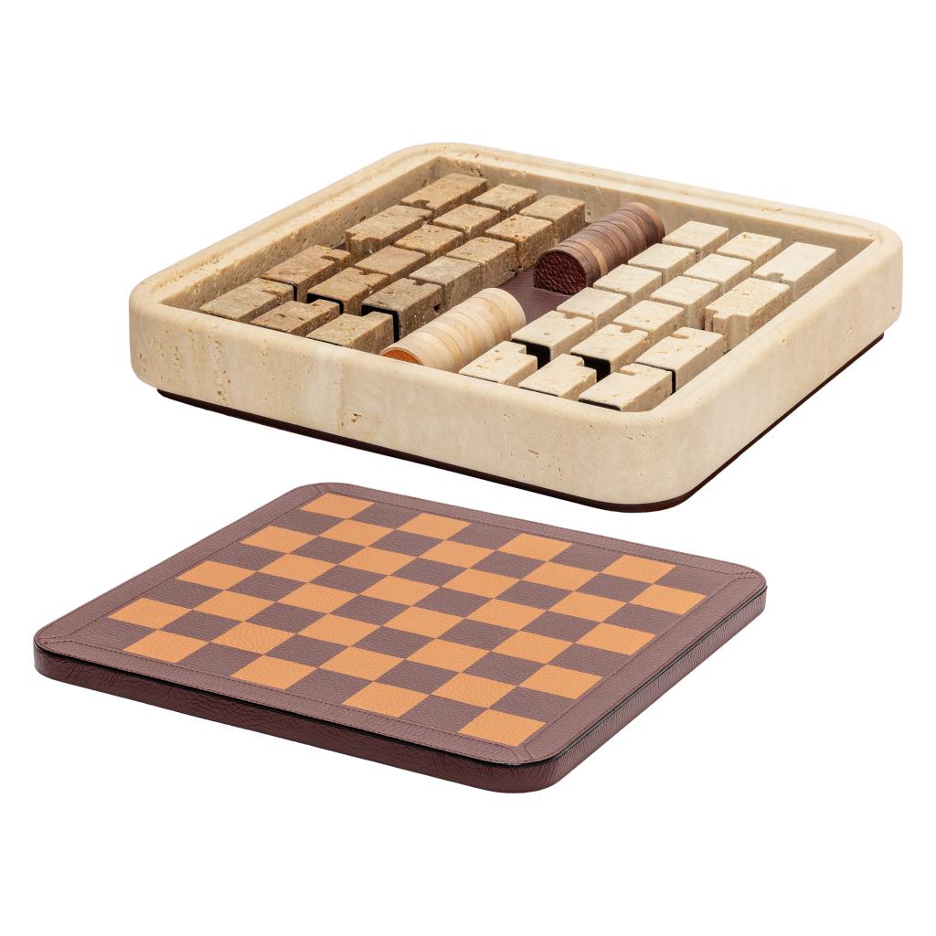 Inside, colored travertine chess pieces are carefully ordered alongside walnut wood and maple dama chips, each housed within dedicated slots shaped to their profiles.