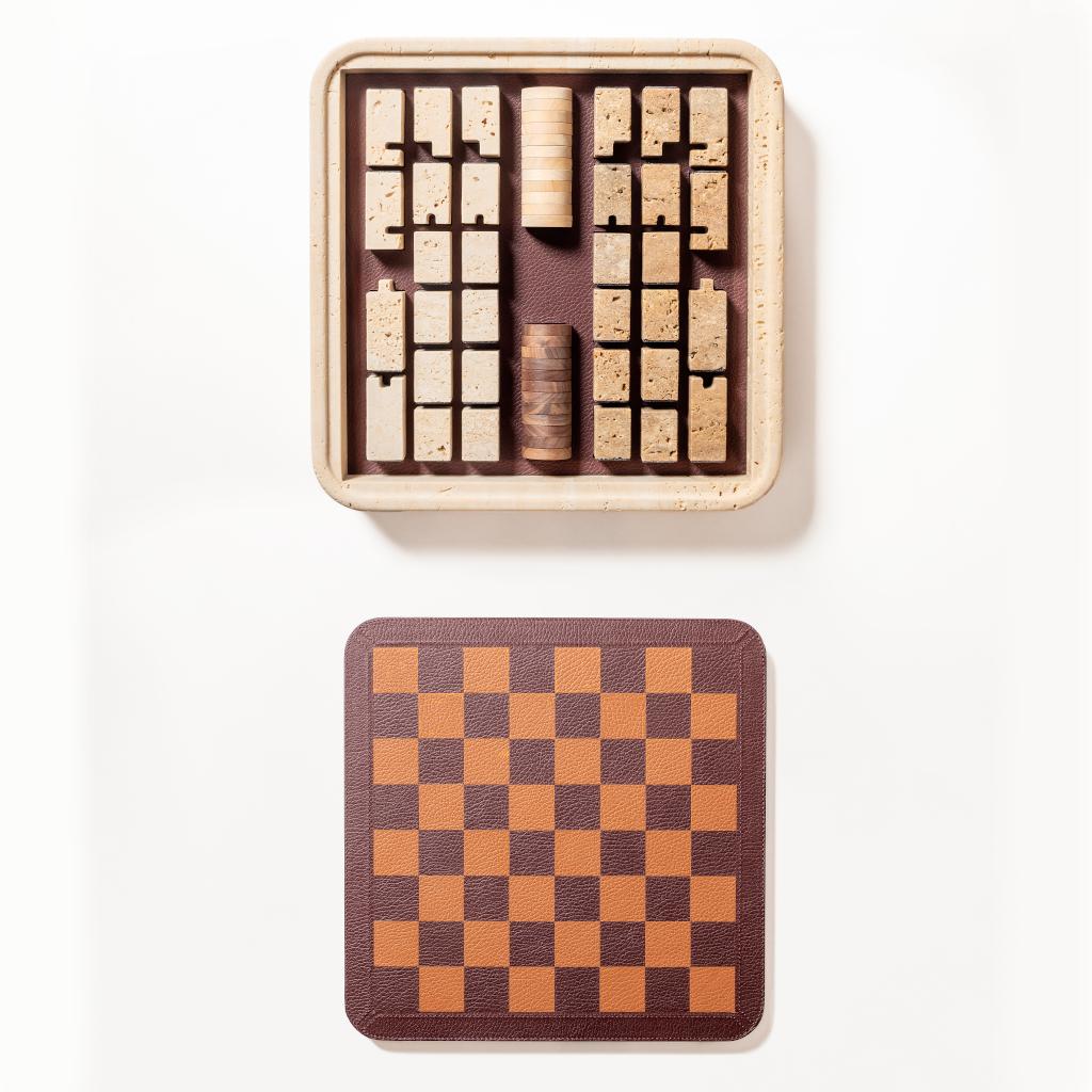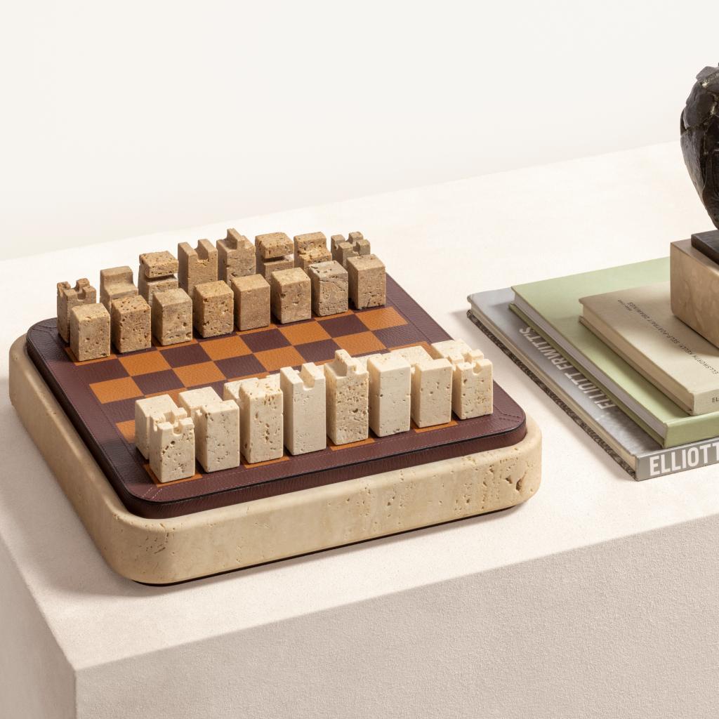 The Rodi chess set presents a composed interplay of mass, surface, and function, shaped around the expressive quality of travertine. The box is carved from a solid block of colored stone and its clear geometry balanced by softened edgesthat lend visual ease and material depth. The removable leather-covered lid features an inlaid chessboard on one side, transforming the act of opening into a precise, deliberate gesture. A leather-covered fixed base beneath mirrors the lid, giving the closed piece a composed symmetry.