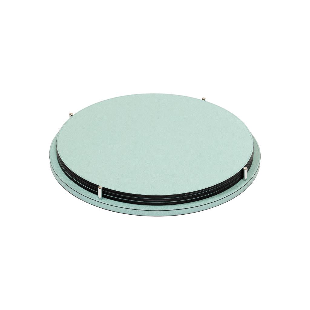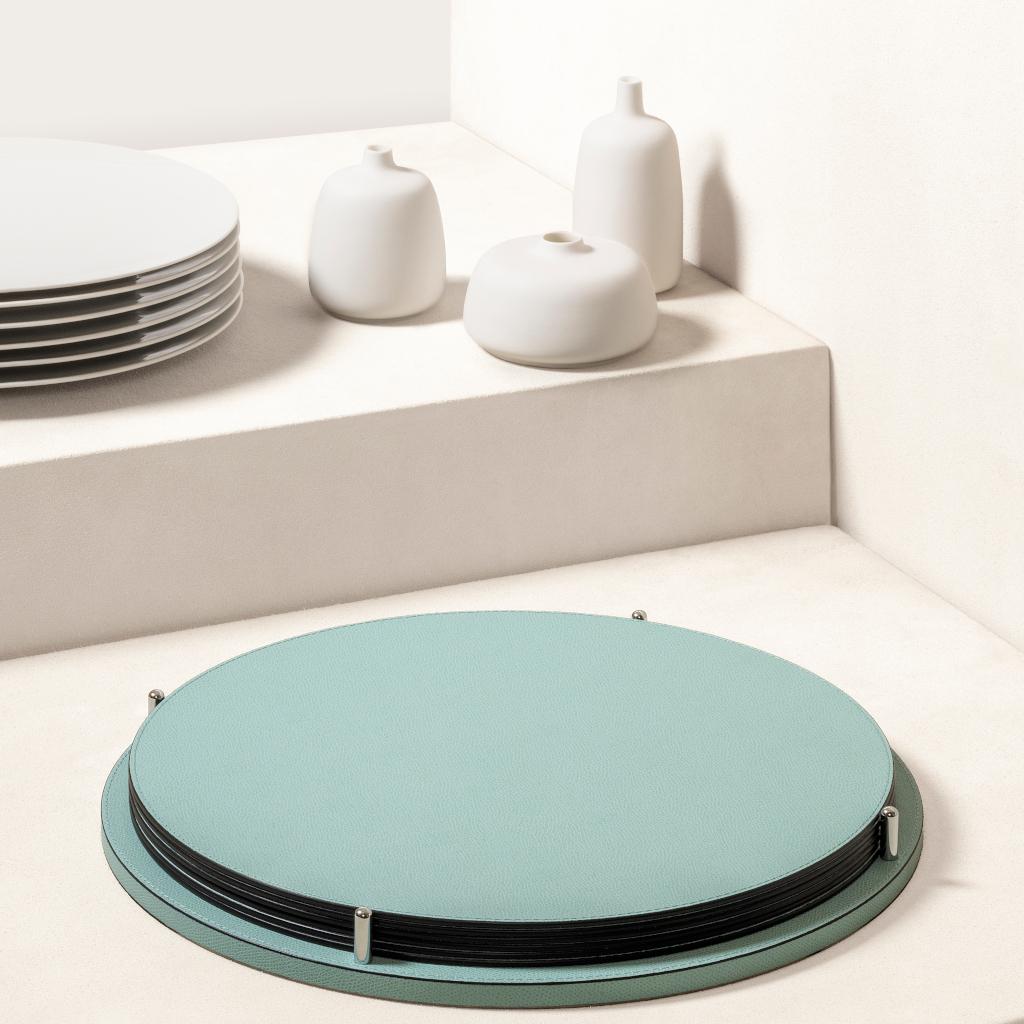 Leather-covered base paired with polished chrome pins that keep 6 placemats neatly aligned, combining order and tactility in a discreet, functional table accessory.