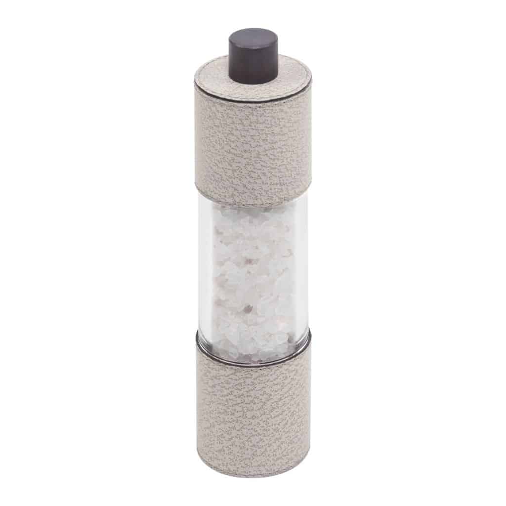 Leather covered stainless steel structure with metal knob. Special ceramic grinder. Continuous grinding adjustment from fine to coarse. Different sizes and finishes available.