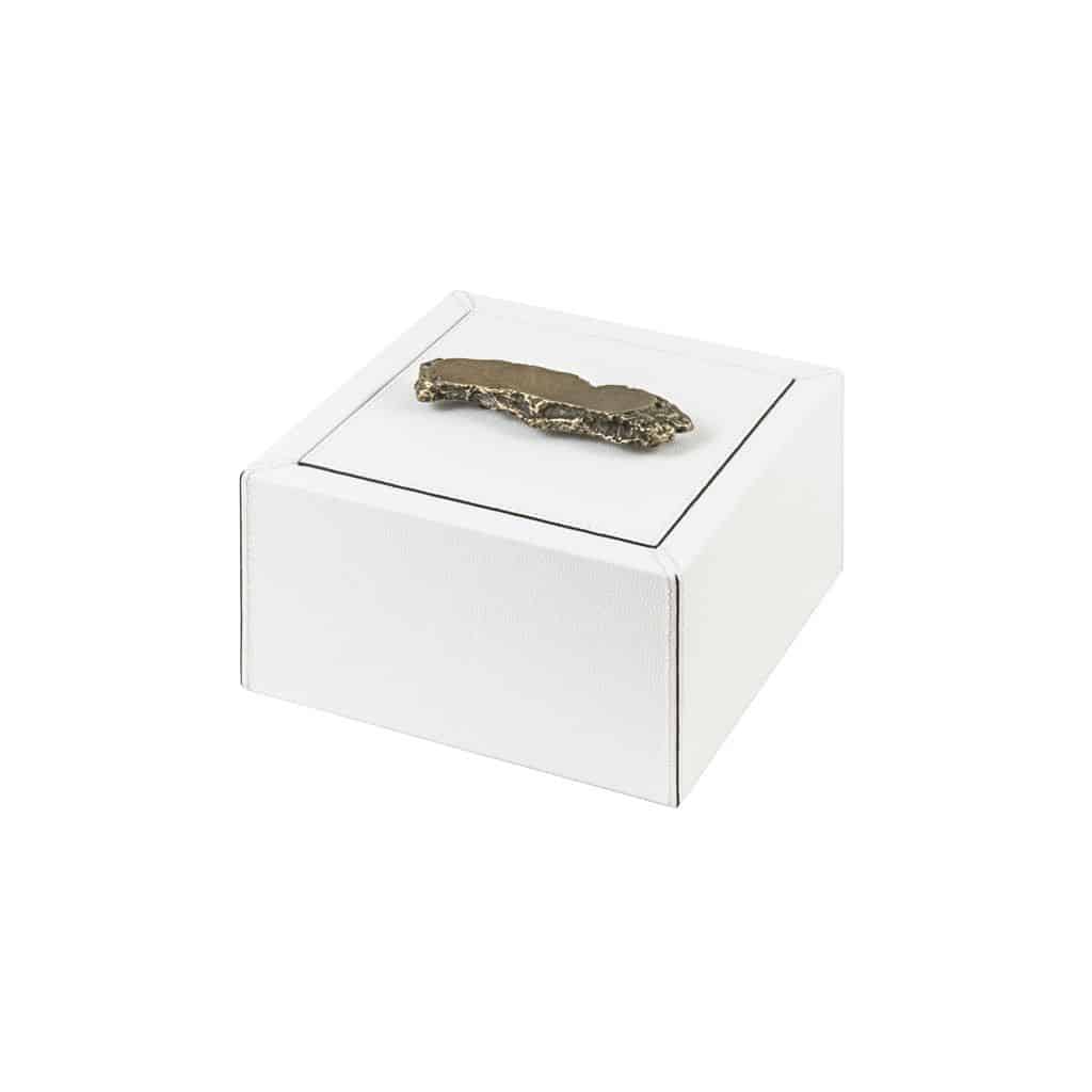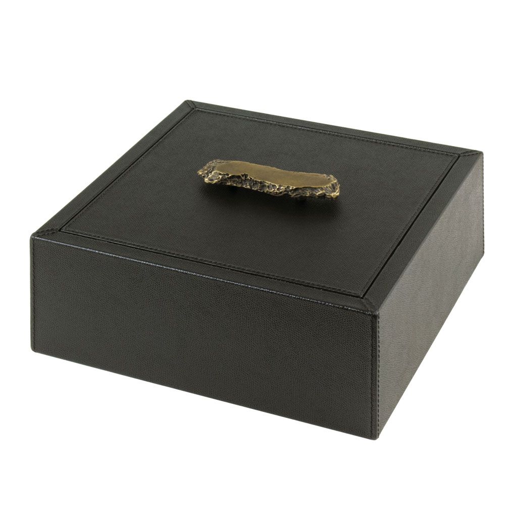 Leather covered wood base and handles with bronze finish. Cavity allows for simple stacking.