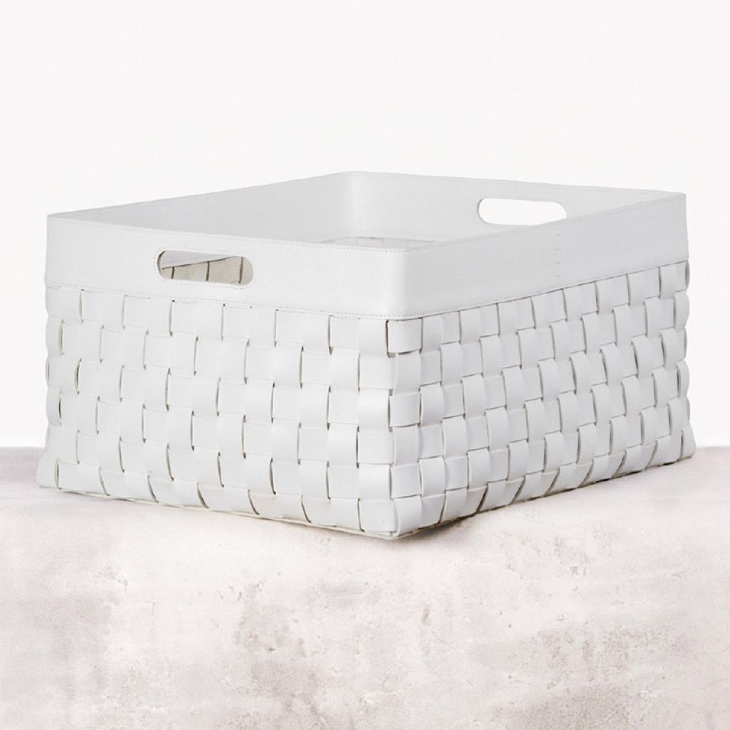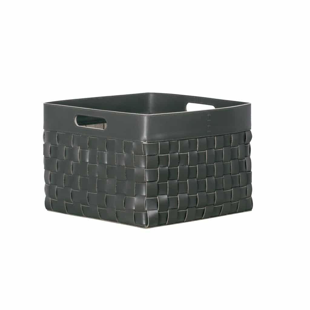 Water resistant woven saddle leather storage basket with handles. Different sizes available.
