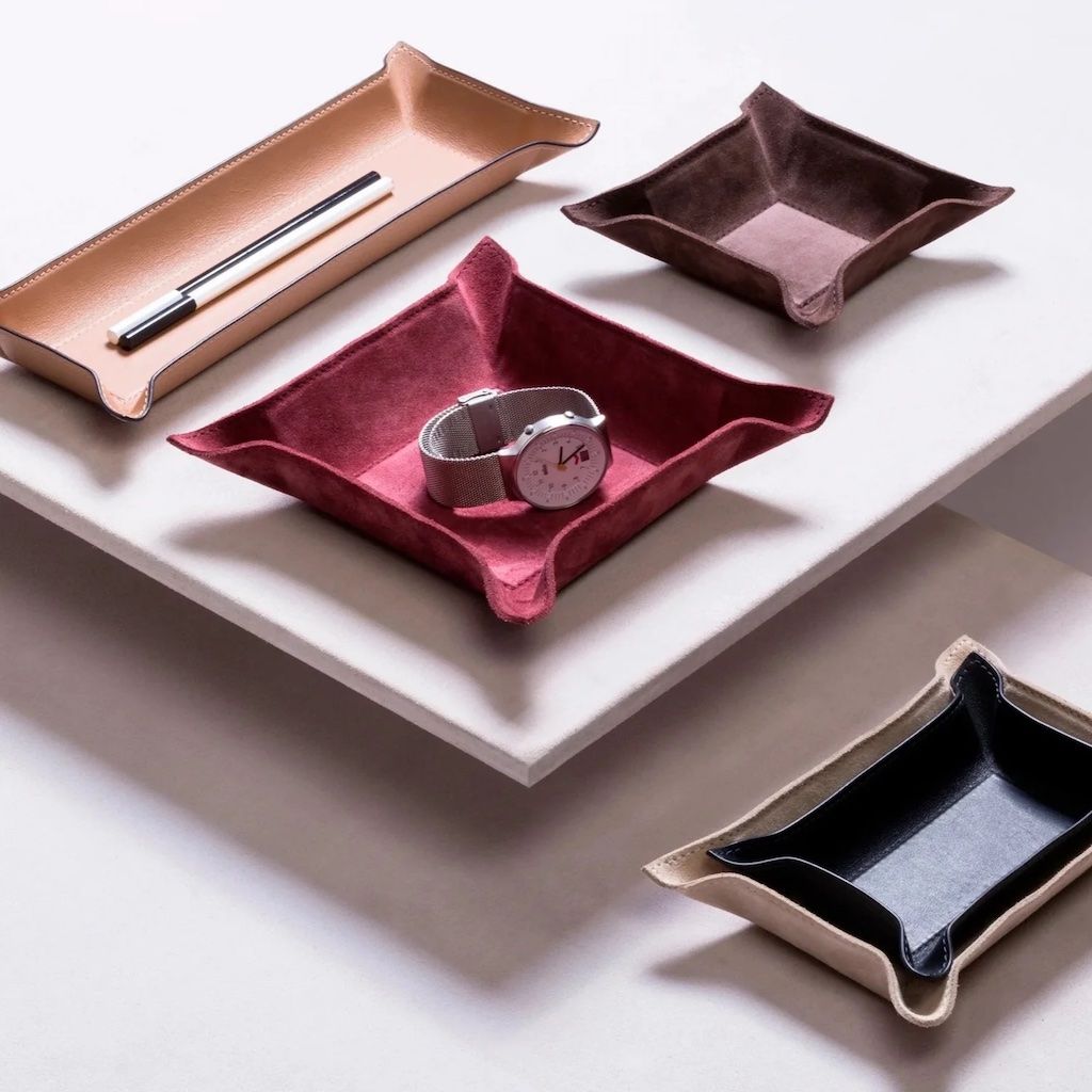 Metal tray covered in handcrafted leather with bendable sides.