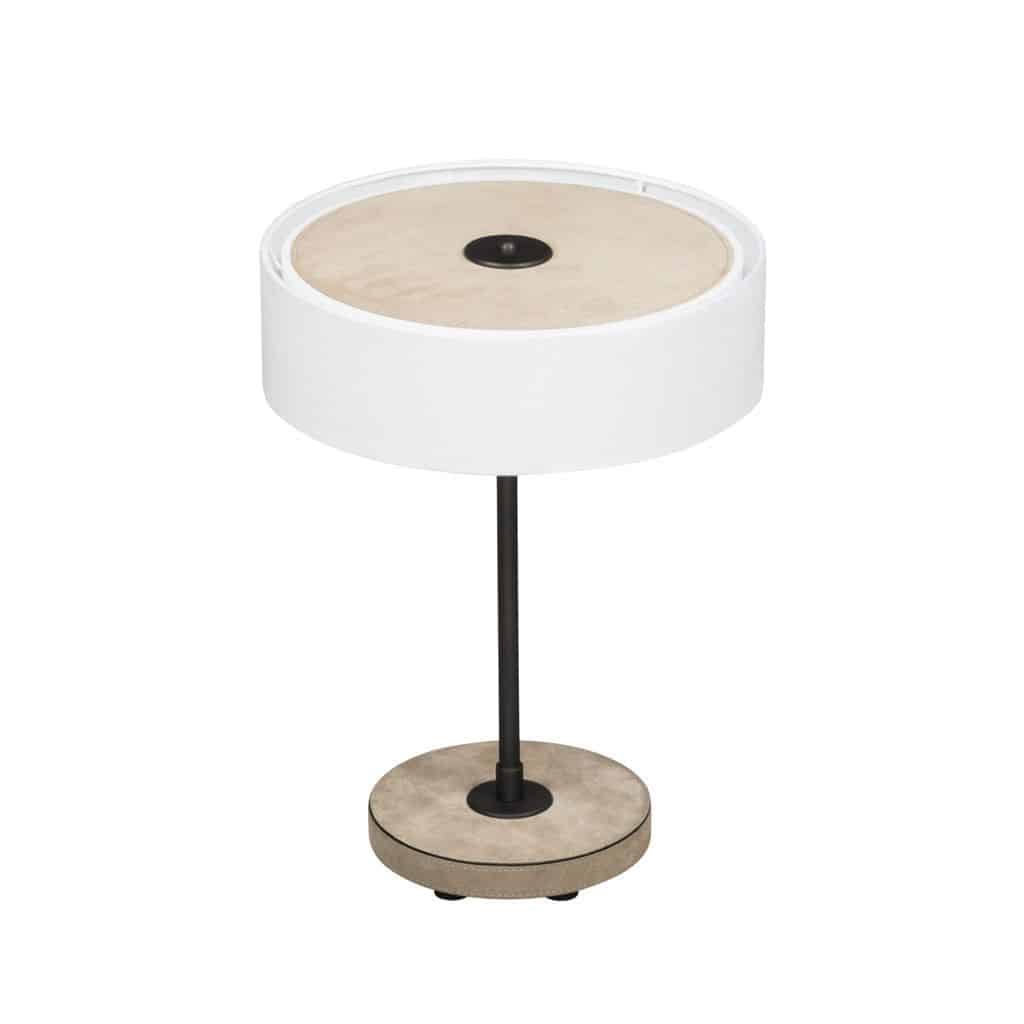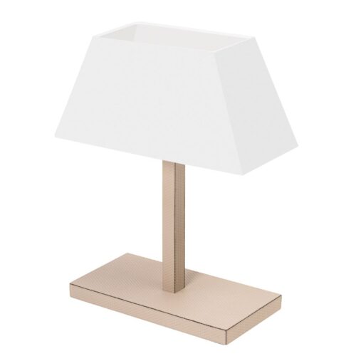 Wood base covered in leather with 3 different finishes. White linen lampshade with fireproof and opal plexiglass diffuser.