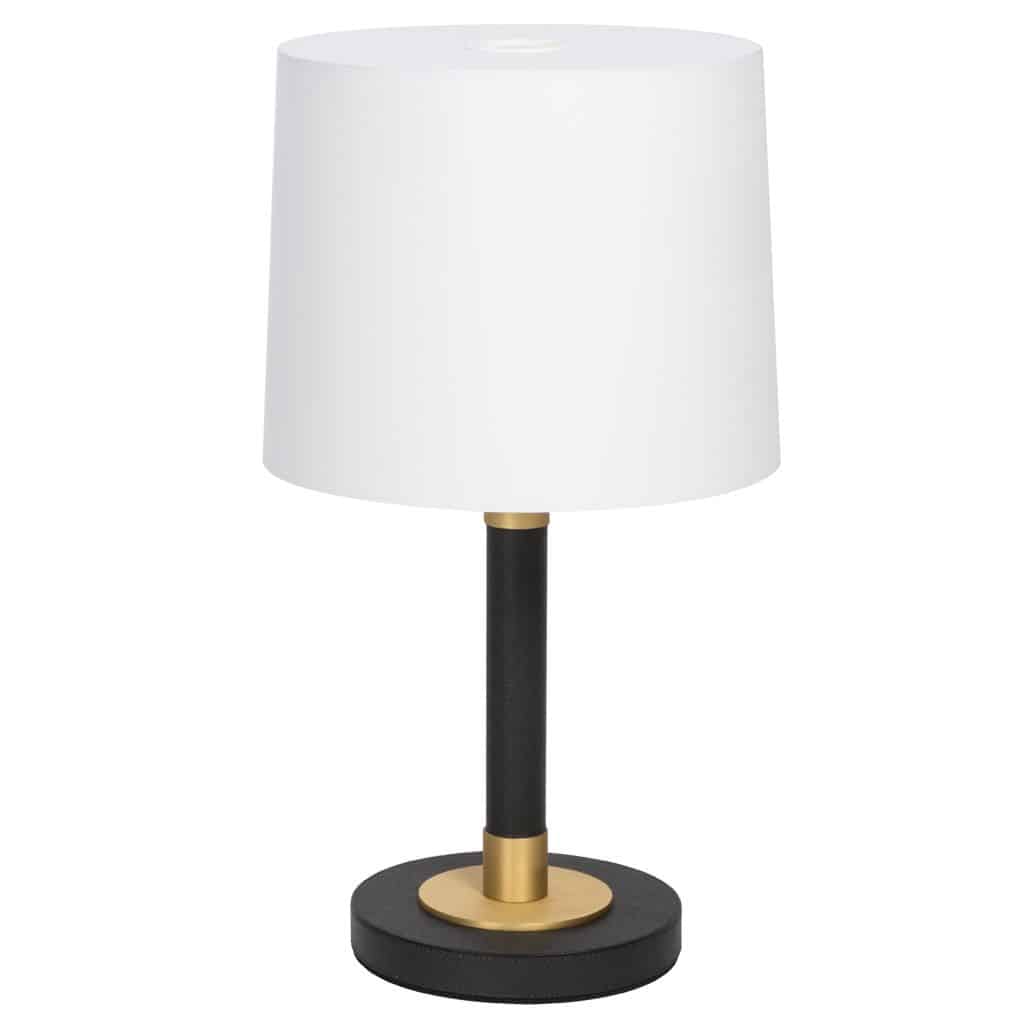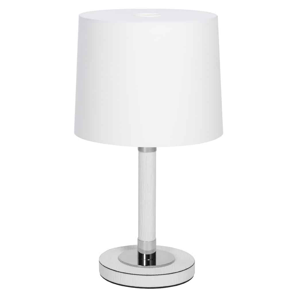 Leather covered wood structure with metal inserts. Fine white cotton lampshade, fireproof diffuser and in line foot switch. Different finishes available: chrome, brass, bronze.
