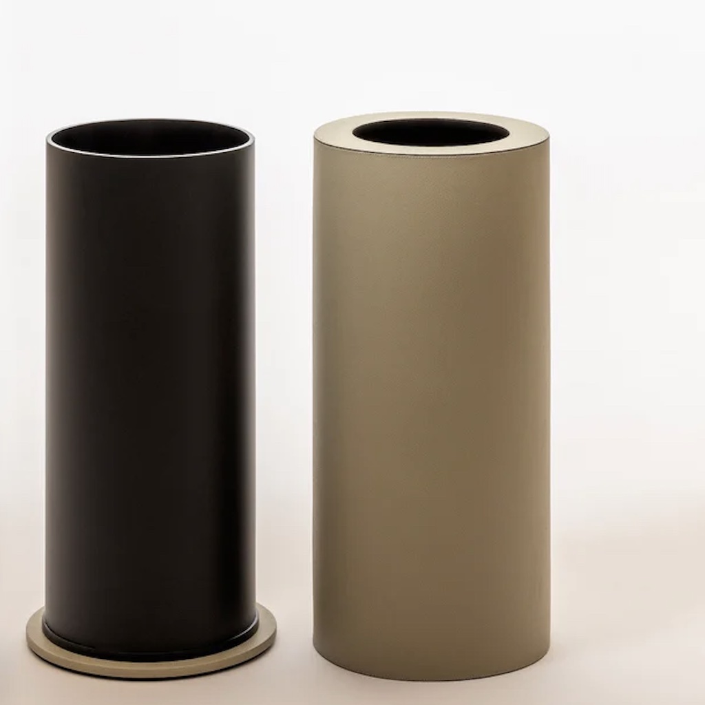 All-leather-covered wood structure equipped with a non-slip waterproof rubber base underneath and a plexiglass inner structure for easy cleaning. The outer structure glides over the inner one, allowing the plastic bag to be secured and discreetly concealed.