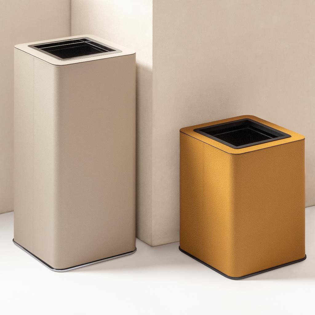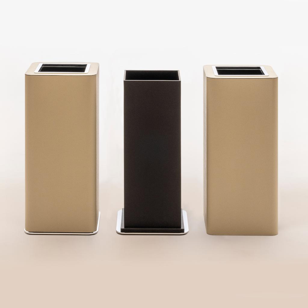All-leather-covered wood structure equipped with a non-slip waterproof rubber base underneath and a plexiglass inner structure for easy cleaning. The outer structure glides over the inner one, allowing the plastic bag to be secured and discreetly concealed.