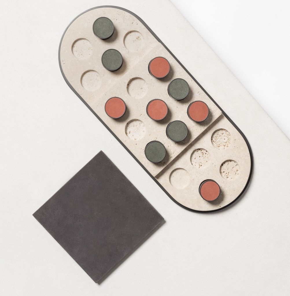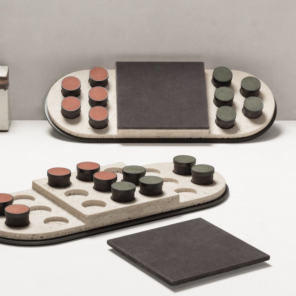 Marble playing field featuring a metal base and a fine leather cover. The set is equipped with metal pieces with leather inserts.