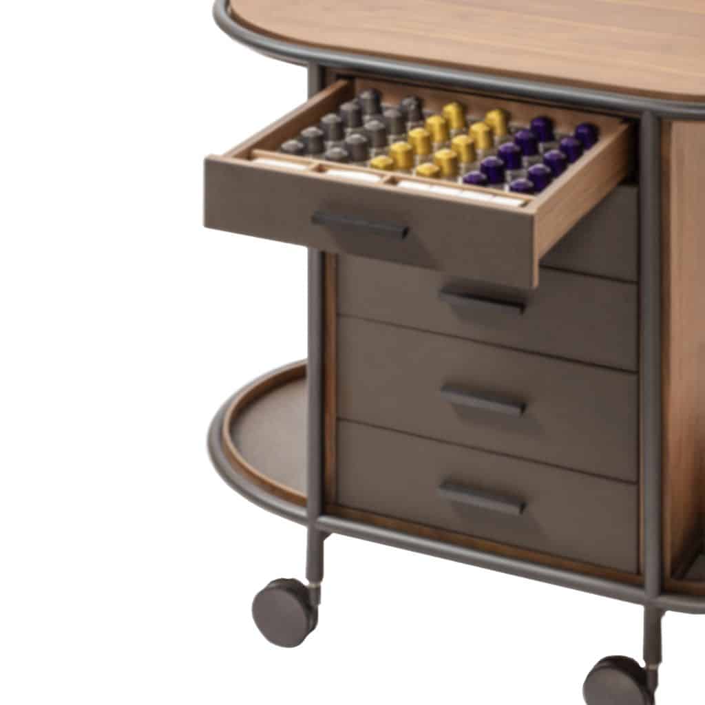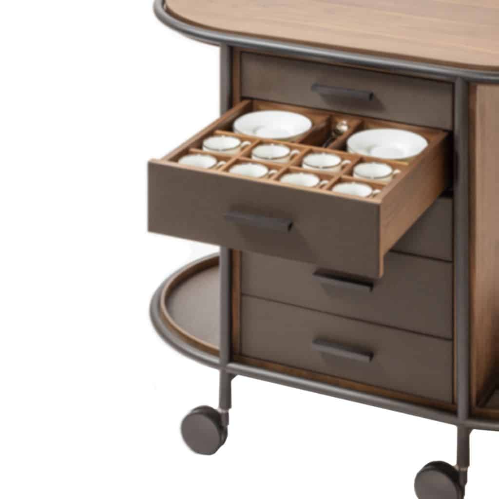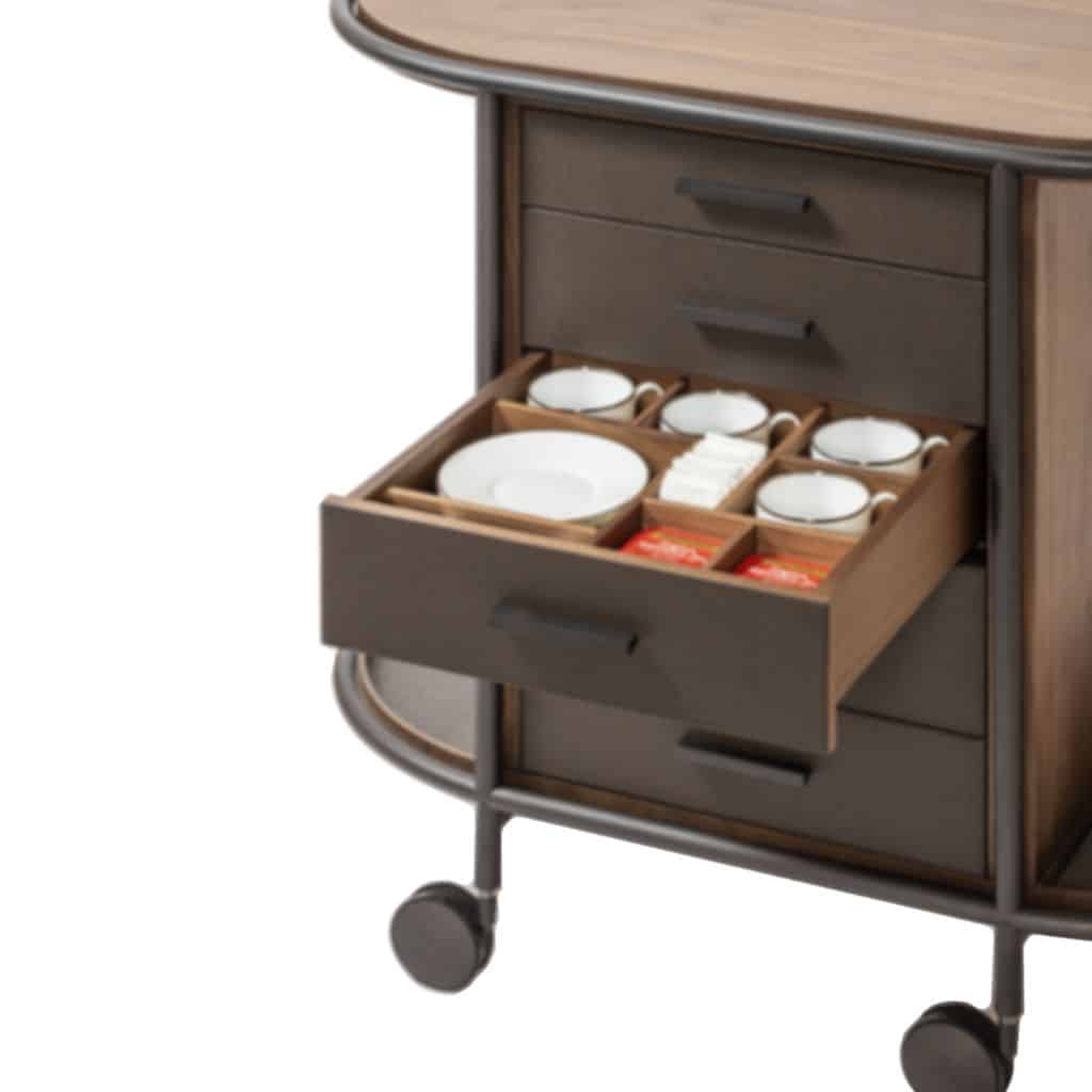 Featuring a four-wheel natural, walnut or wenge structure, a metal frame and wheels available in three finishes, this refined tea and coffee cart is the epitome of functionality and sophistication. With five organized drawers with sleek metal handles, it provides ample storage for coffee capsules and tea bags, ensuring everything is within reach. Included with the cart is a luxurious set of porcelain coffee and tea cups with matching plates, adorned with a delicate silver graphic trim. Complementing this are wood service trays and coasters, adding atouch of understated elegance. Designed with mobility in mind, this furniture piece on wheels effortlessly combines style and practicality. Perfect for storing all your tea and coffee essentials, it’s an elegant solution for both everyday use and special occasions.