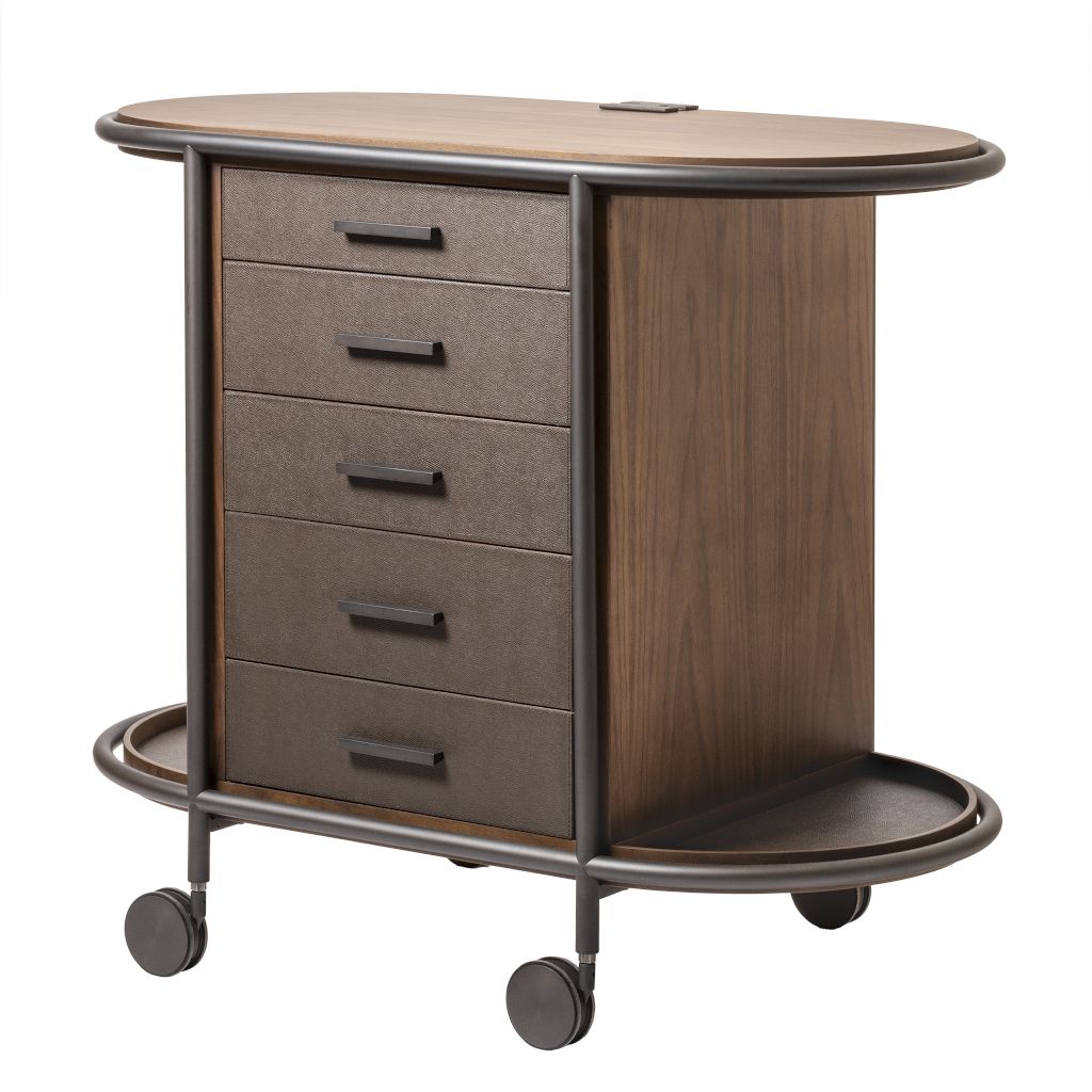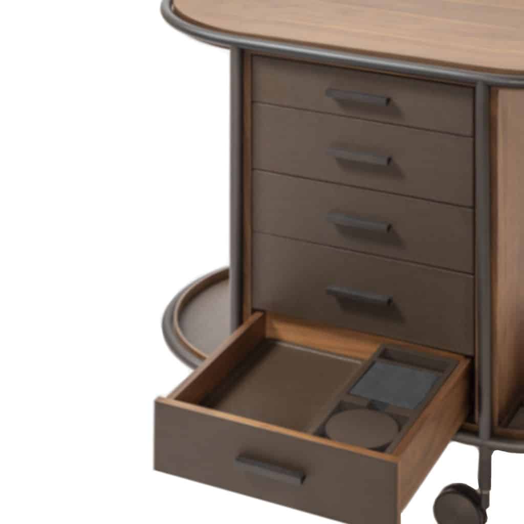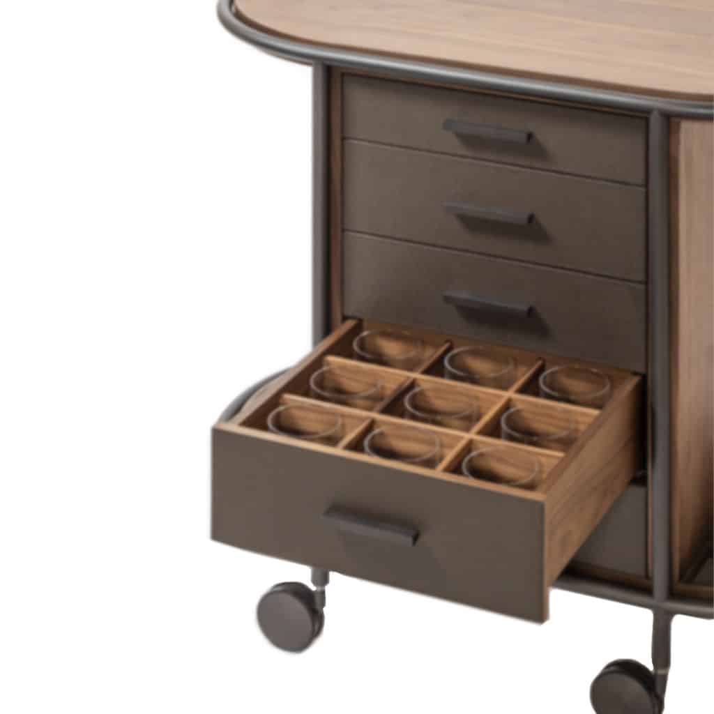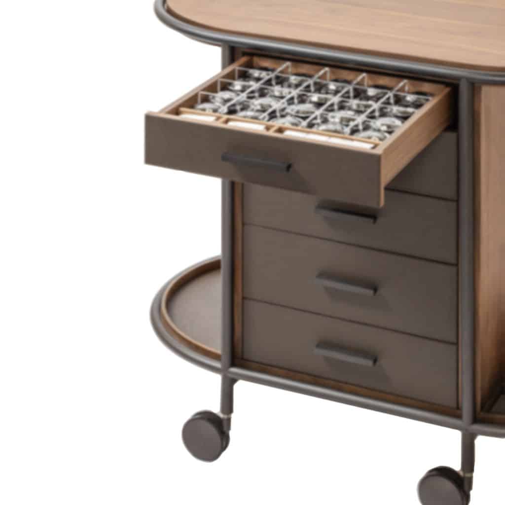Featuring a four-wheel natural, walnut or wenge structure, a metal frame and wheels available in three finishes, this refined tea and coffee cart is the epitome of functionality and sophistication. With five organized drawers with sleek metal handles, it provides ample storage for coffee capsules and tea bags, ensuring everything is within reach. Included with the cart is a luxurious set of porcelain coffee and tea cups with matching plates, adorned with a delicate silver graphic trim. Complementing this are wood service trays and coasters, adding atouch of understated elegance. Designed with mobility in mind, this furniture piece on wheels effortlessly combines style and practicality. Perfect for storing all your tea and coffee essentials, it’s an elegant solution for both everyday use and special occasions.